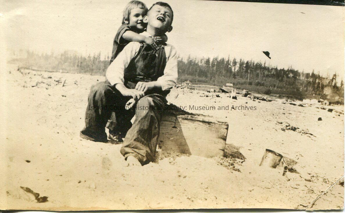 A photo of two young children playing at the beach. The older child is sitting on a wooden box in the sand and the younger child has his arms around the older boy's neck. Both children are smiling at the camera and wearing overalls. There is sand in trees in the background.