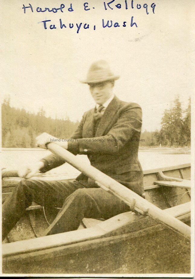 A photo of a man in a row-boat. The man is wearing a dark-colored suit, tie and hat. He is also wearing glasses. The man has the ores in his hands and is smiling at the camera. There are trees and water in the background. The top of the photo says, "Harold E. Kellogg, Tahuya, Wash".Lexicon
