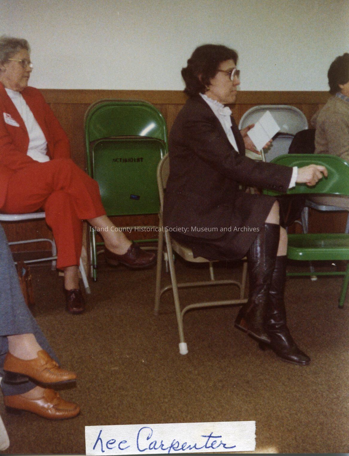 League of Women Voters of Whidbey Island. Three women sit on folding chairs at Coupeville Methodist Church. Label at bottom reads "Lee Carpenter" (state board member.)