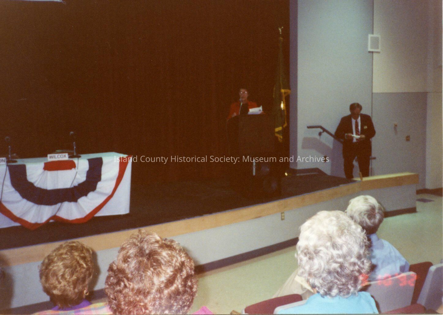 League of Women Voters of Whidbey Island. Woman stands at lectern on stage at Coupeville High School. Man on stairs looks at papers in his hand. A table prepared for candidates and decorated in red, white, and blue stands to left. Audience members appear in foreground.