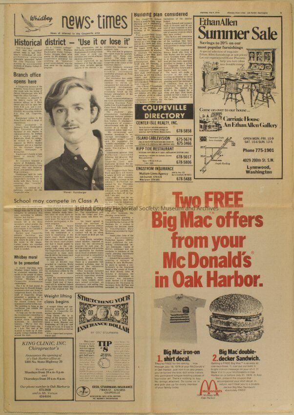 Whidbey News Times July 8, 1976 page 9 article entitled, "Historical district - 'Use it or lose it' ". The article describes the presentation of comprehensive planning proposals before the City Planning Commission by environmental students of Huxley College in Bellingham. The students' program folcuses on Coupeville's potential for retaining an "historical preservation district". The presentaion was led by Bill Davis.