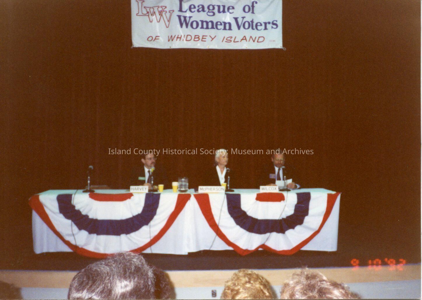 League of Women Voters of Whidbey Island. Judicial candidates sit at a table, decorated in red, white, and blue, on stage at Coupeville High School. Signs on table identify them as (Clarke) Harvey, (Joan) McPherson, and (Merle) Wilcox. A large banner for LWVWI hangs above.Lexicon