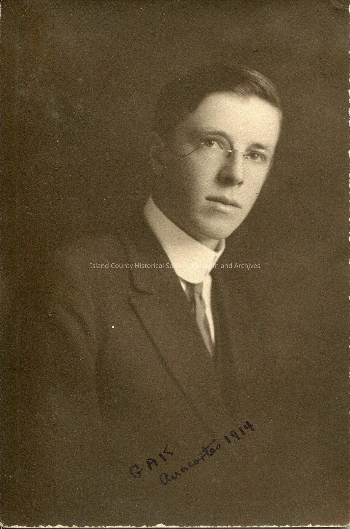 A black and white portrait photograph of a young man. He is wearing a dark colored suit with a tie and white collar. He is also wearing glasses. The back of the photo says, "George A. Kellogg, Age 20. 1914. Additionaly, there is "GAK, Anacortes 1914" written on the front of the photo.Lexicon