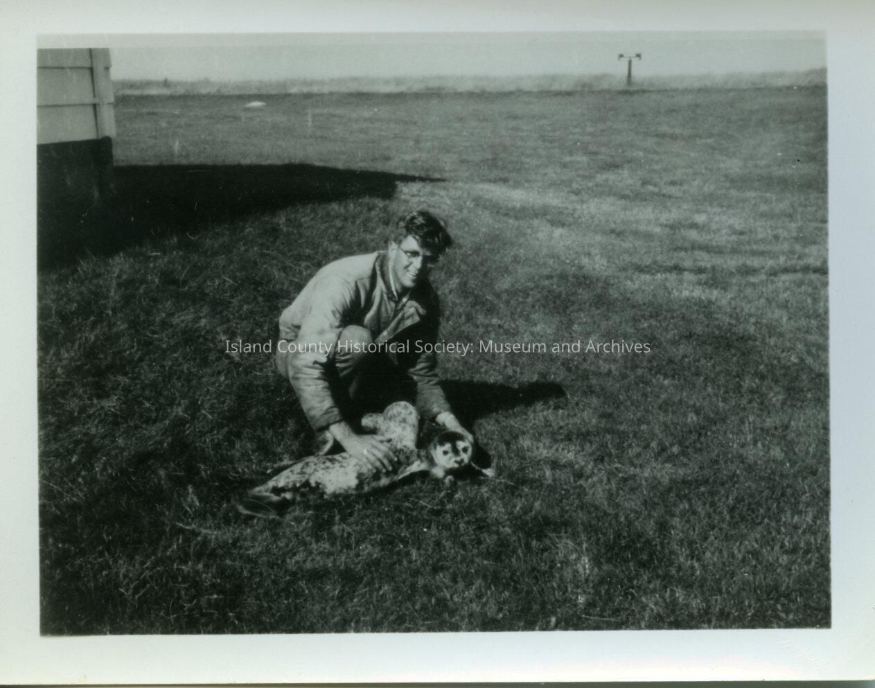 A small photo a man bending down and hands on baby seals. Hand written on the back is "Me and baby seals."Collection