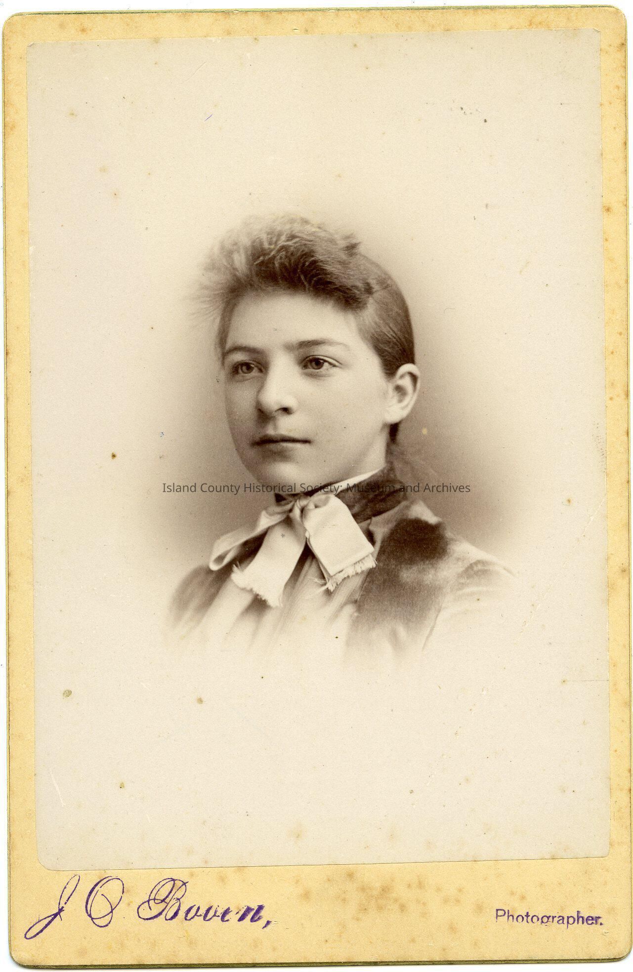 Studio photo of a young woman, shoulders up. She is looking to her right. She is wearing a jacket, blouse, tie ribbon around her neck, high collar. On the back: Ada Blowers Watson