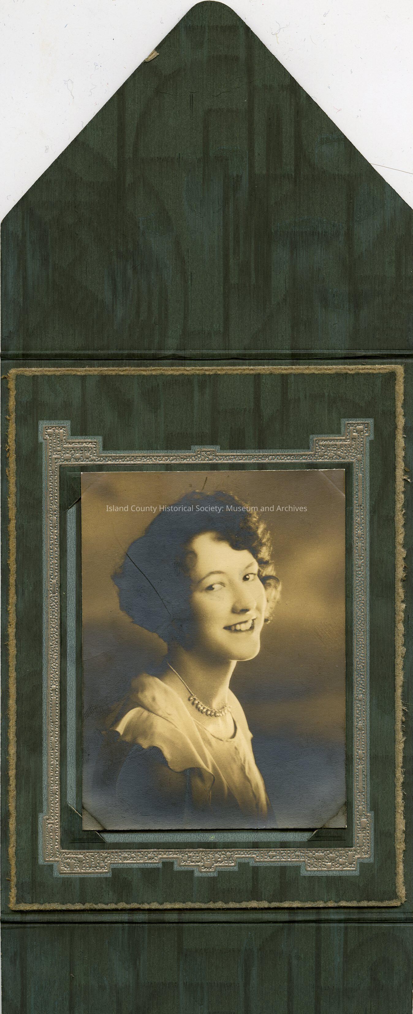 Studio photo of a young woman seated facing her left and she is looking back towards the camera. She is wearing a chiffon top or dress, beaded or pearl necklace. On the back: C 1930/1931