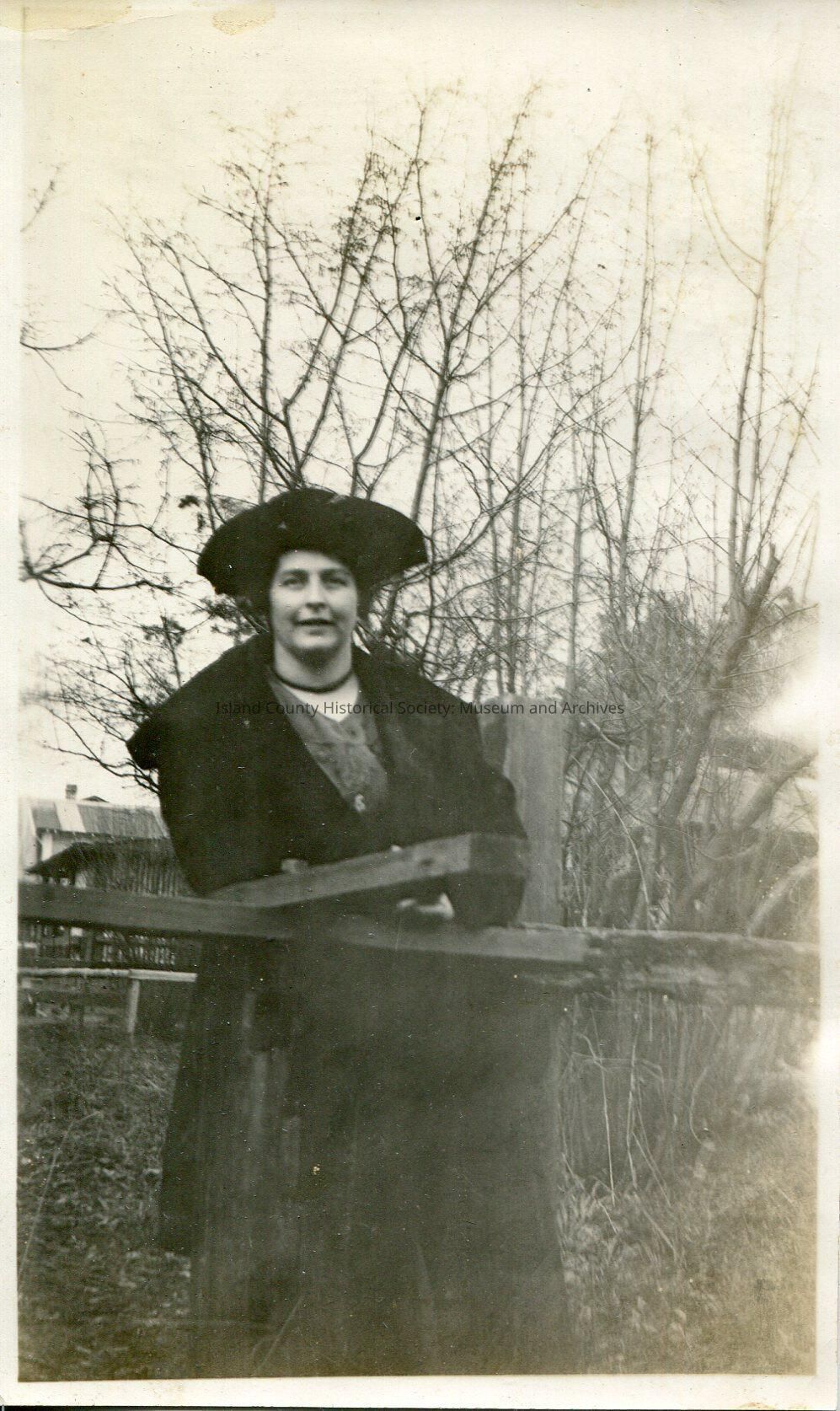 A black and white photo of a woman leaning against a fence. She is wearing a black hat and jacket. There are other fences, a couple houses and trees in the background. The trees are bare.