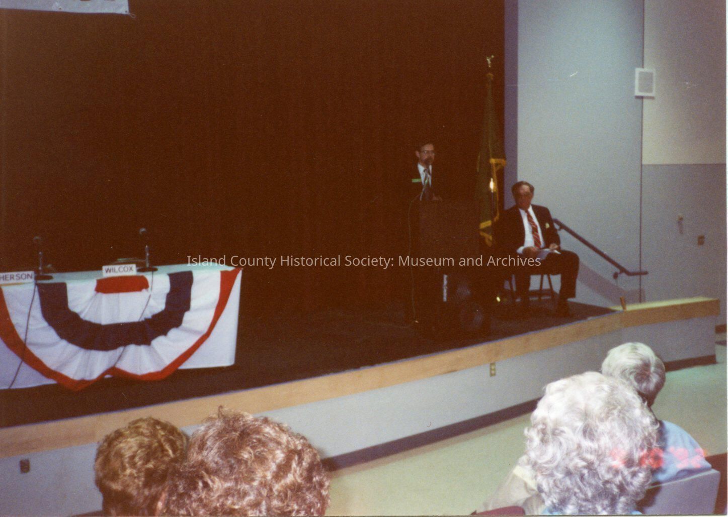 League of Women Voters of Whidbey Island. Candidate at lectern on stage at Coupeville High School. Another candidate sits to right. On left is a table decorated in red, white, and blue. A large banner for LWVWI hangs above.