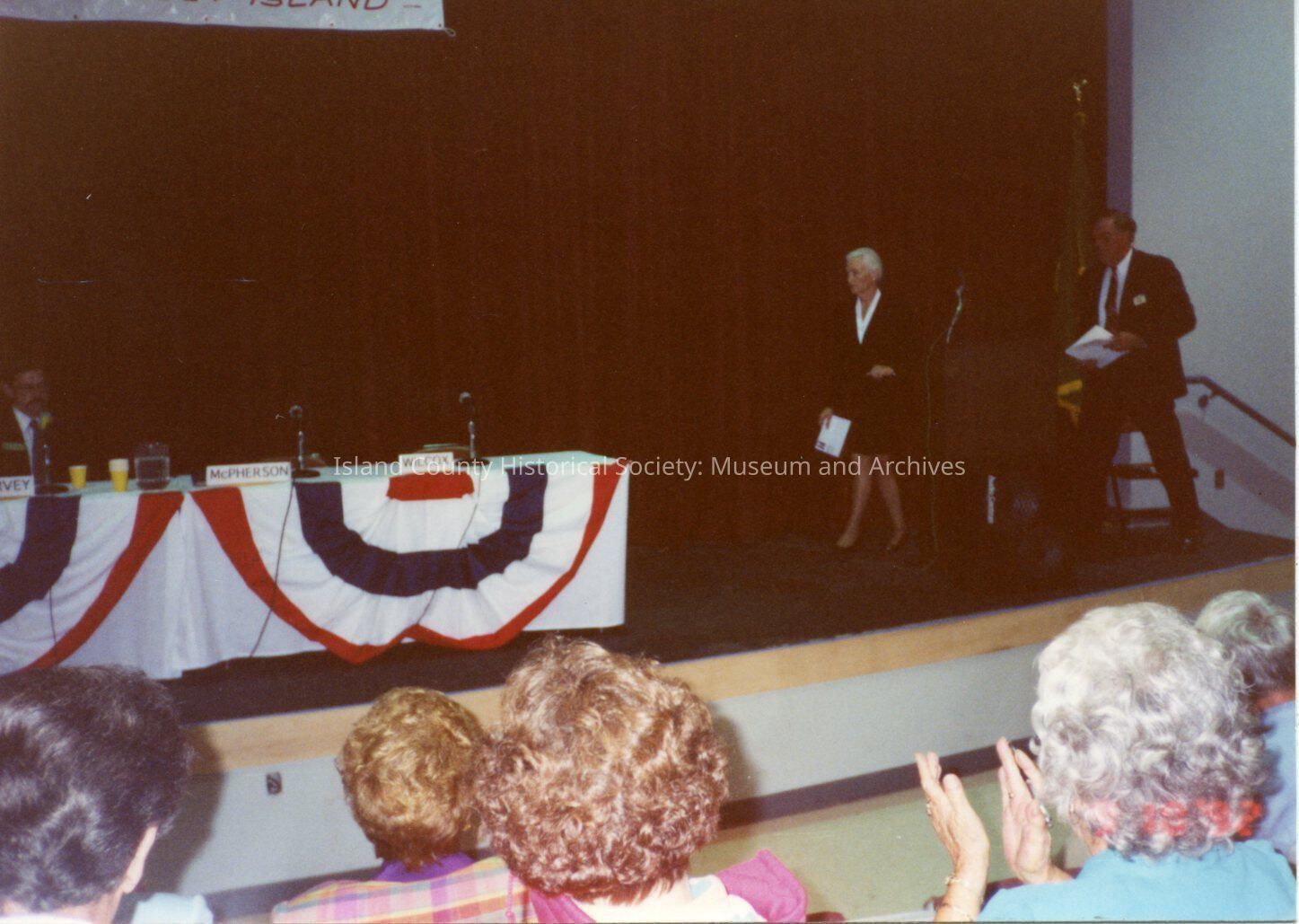 League of Women Voters of Whidbey Island. Wpman and man walk on stage at Coupeville High School. On left is a table decorated in red, white, and blue. A large banner for LWVWI hangs above. Heads of audience members are visible in foreground.
