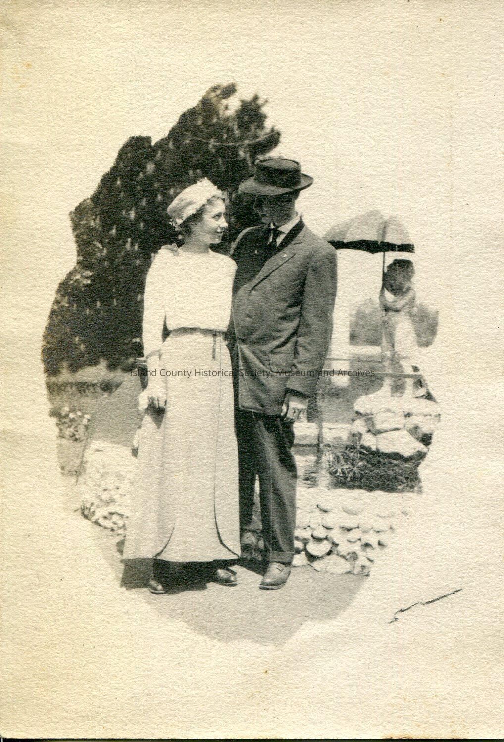 A black and white photo of a couple standing next to each other. The man has his right arm around the woman and they are smiling at each other. Possibly a wedding picture. The woman is wearing a white skirt, white blouse, and a white hat. The man is wearing a suit, tie and hat. There is a fenced-off fountain the background.Lexicon