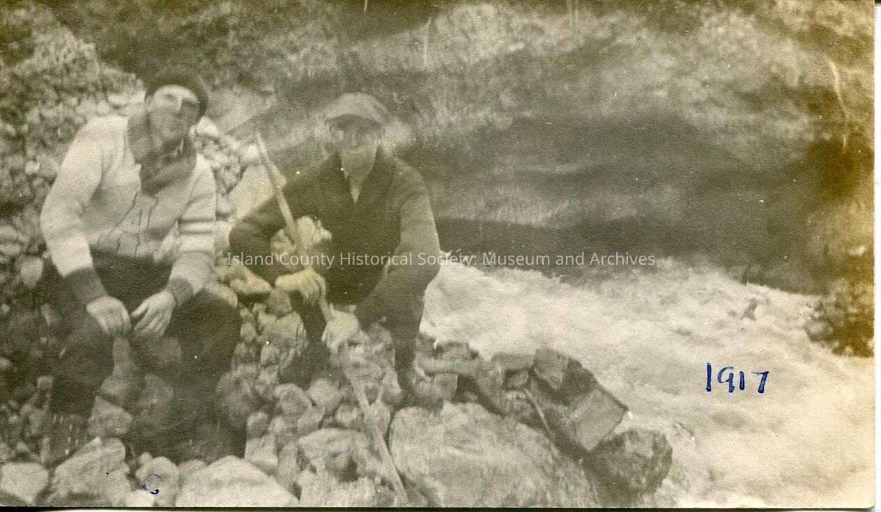 A black and white photo of two men sitting on rocks next to a fast-flowing river. Both men are wearing slacks, sweaters with collars and hats. The man on the right side of the photo is holding a walking stick. The right-side of the photo has, "1917" written on it in blue pen.