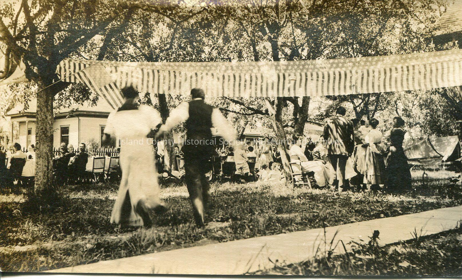 A black and white postcard of a party--possibly a wedding. There are tables and chairs set up outside. An American flag banner is hung between two trees and there is another American flag hanging on a tree. There are about 25-35 people pictured. All of the men are wearing suits and all of the women are wearing dresses.