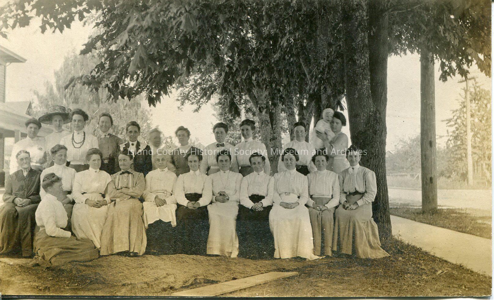 A black and white postcard of a group of women posing for the portrait. There are 23 women and one baby in the photo. There is a house/building on the left side of the photo and a sidewalk on the right side of the photo. There are also trees and powerlines visible in the background. All of the women are wearing dresses or skirts and blouses. They also all have their hair pulled back. The woman on the far right of the photo (in the back row) is holding a baby.