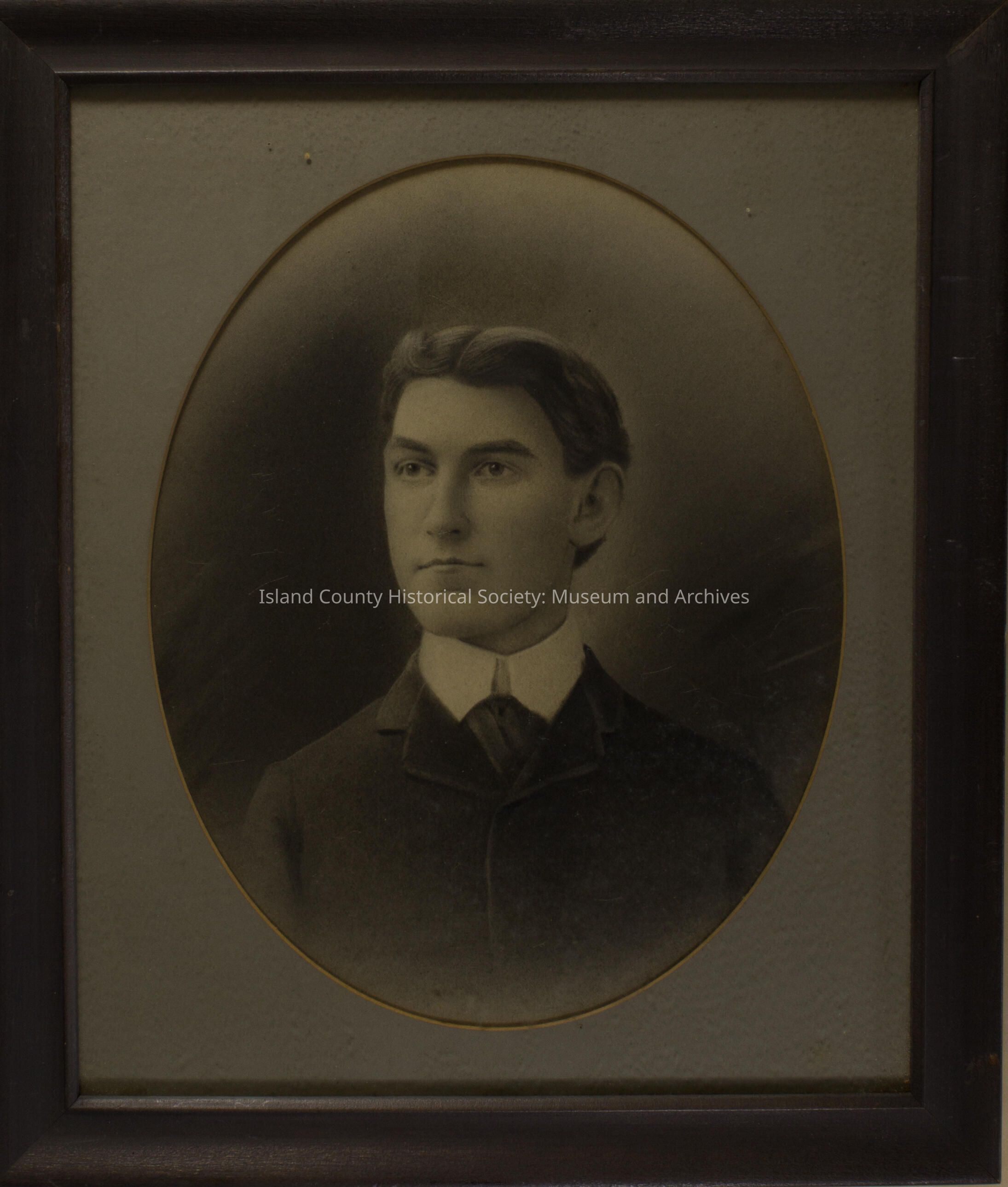 This black and white framed photo is of Harold Ebey, son of Ellison and Mary Ebey. In the photo Harold is wearing a dark suit and the picture is framed behind an oval mat.
