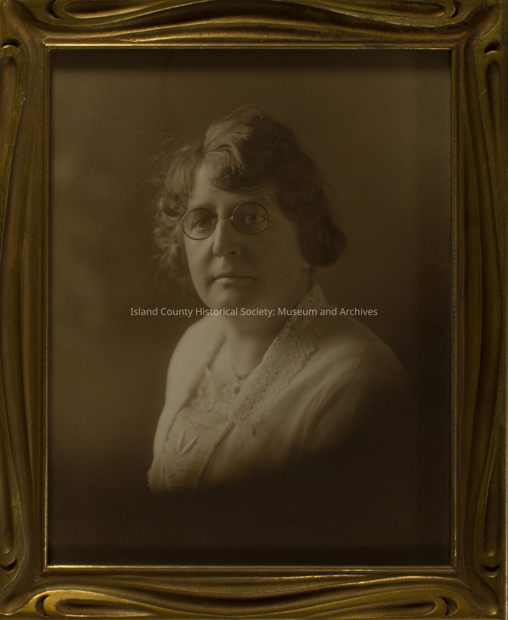 This black and white framed photo is of Annie Schrick, daughter of Mary Ebey and step daughter of Ellison Ebey. The photo is in a gold frame and the woman has glasses on and a white dress.