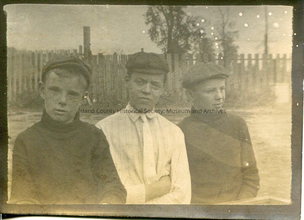 A black and white photo of a group of three boys. All three boys are wearing hats. The boys on the right and left are wearing dark colored shirts and the boy in the middle is wearing a white shirt and white tie. Two of the boys are looking at the camera. There is a fence and a couple trees in the background.