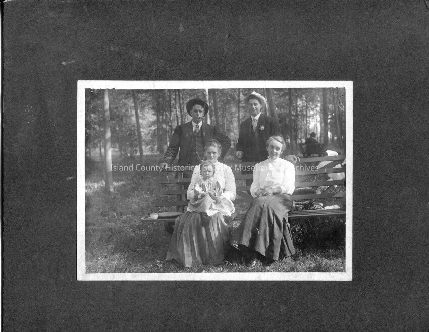 This black and white unframed photo is of two men standing behind two woman and a child sitting on a bench outside. Handwritten on the back is "F. J. Denenny 716..."