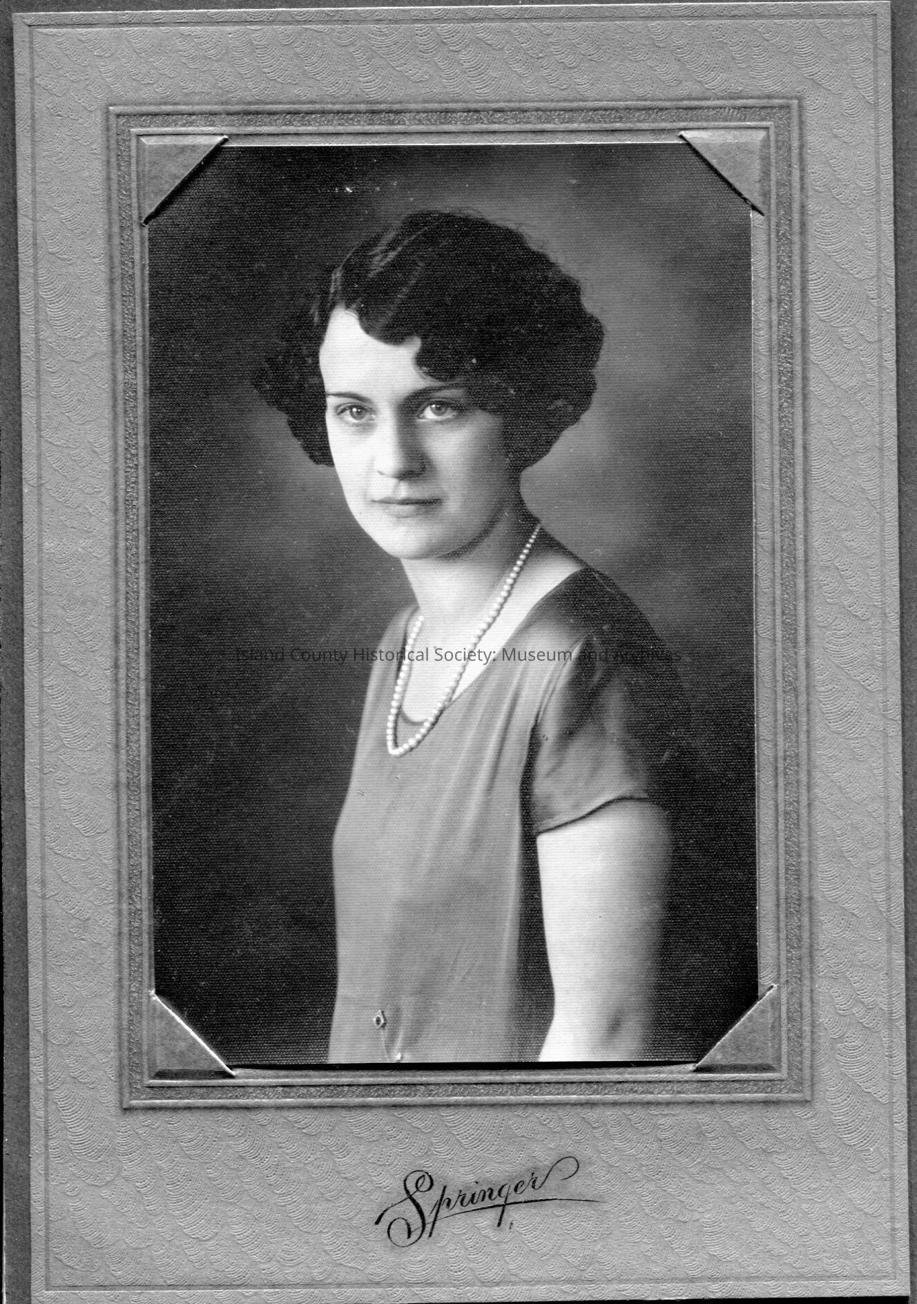 This black and white fold over mat-framed photo is of a woman with black hair and a pearl necklace. On the back of the mat is "Class Easel."