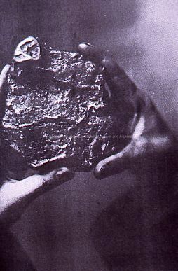 Photograph of hands holding an artifact, possibly a meteorite or large gold ore.