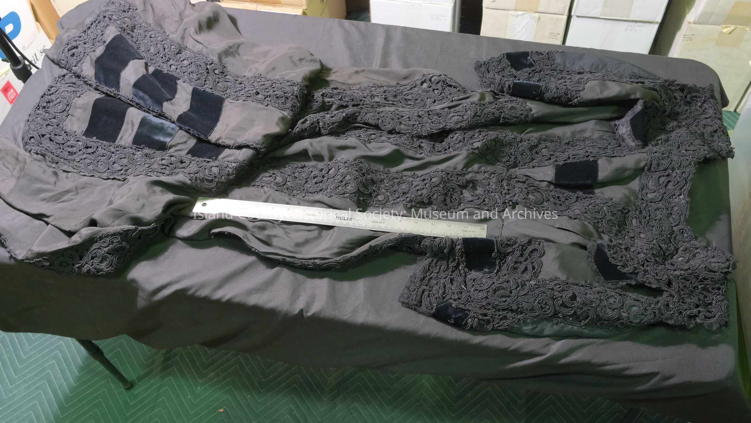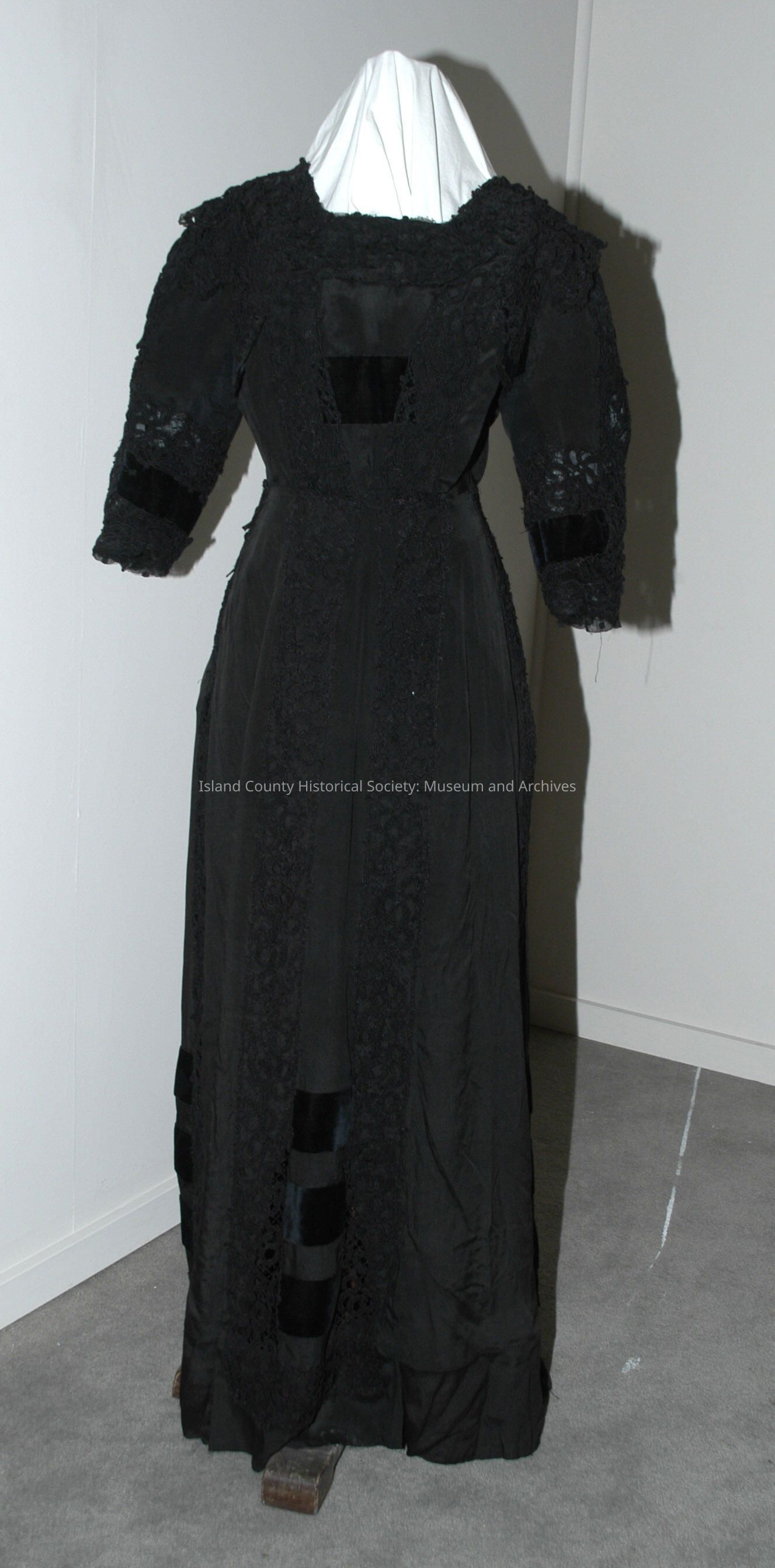 Black crepe dress with braid panels velvet trim.