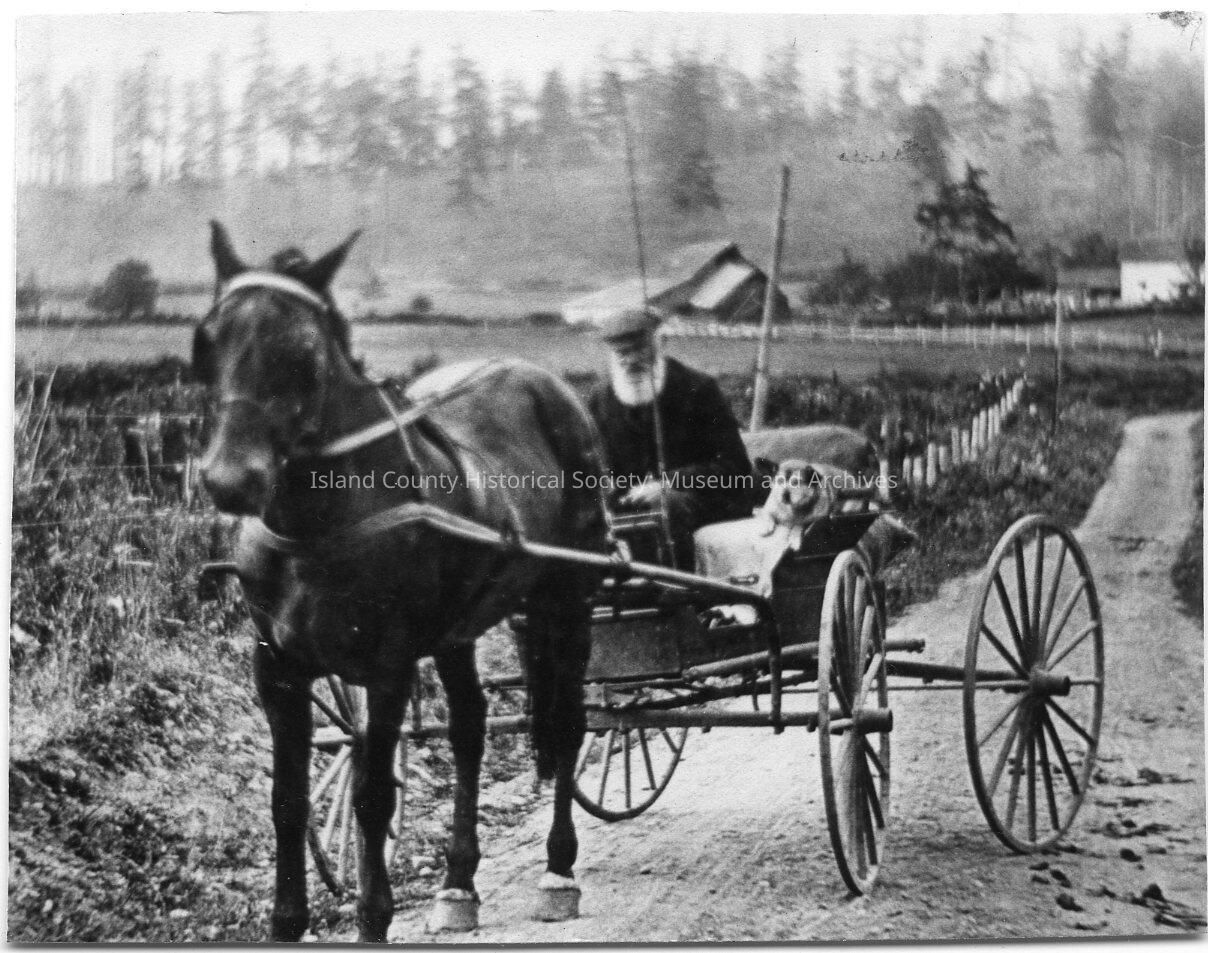 Black and white photo of man and a dog in a horse and buggy. Pictures used in book, "Whidbey Island Memories: Screwball Things I Remember." Caption: Mr. Millenaar driving his one-horsepower buggy. Photo No. 7, Page 14. Photograph provided to author by: Martha Dykers.