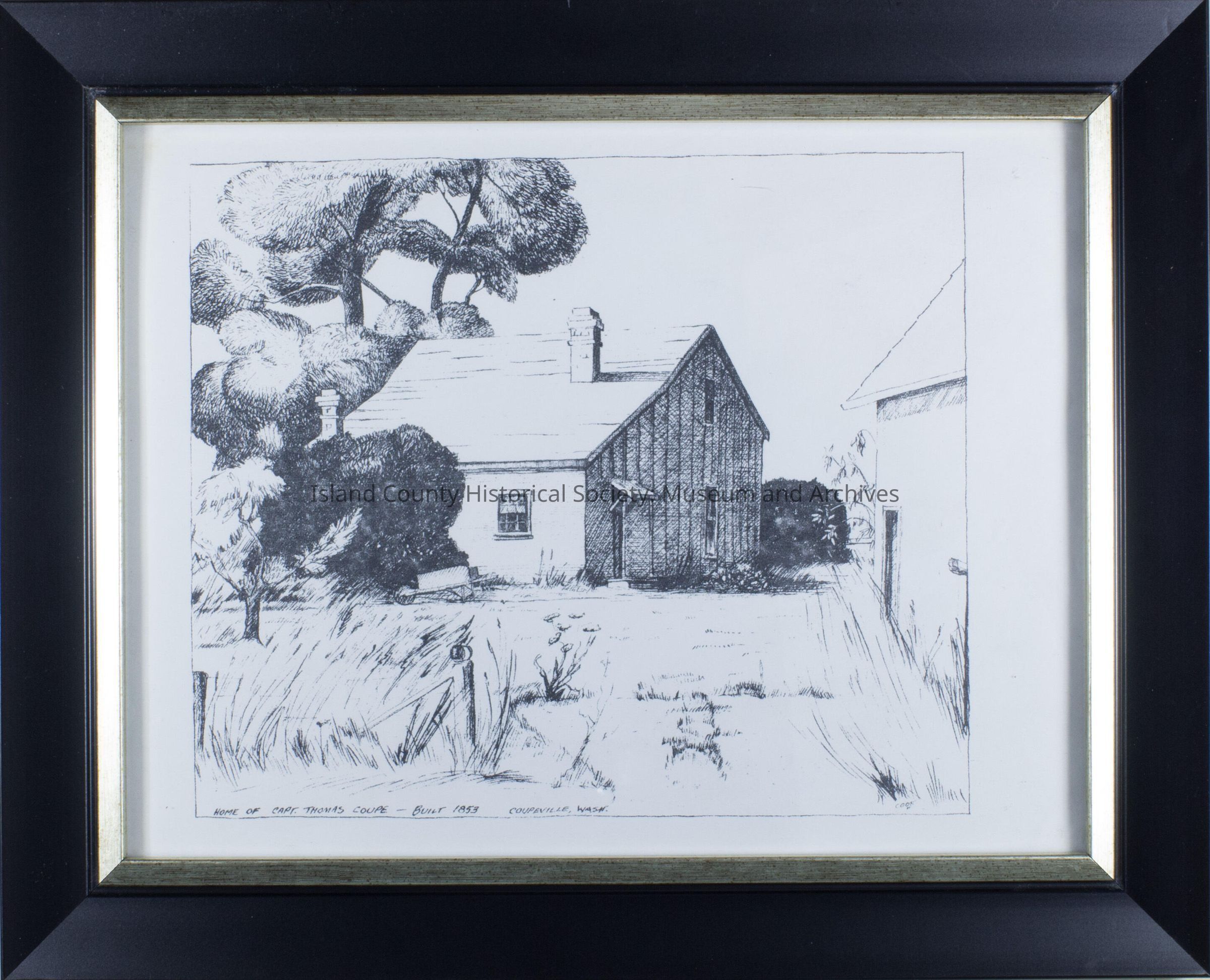 A black and white drawing in a frame of the (handwritten on the front) "Home of Capt. Thomas Coupe ---Built 1853 Coupeville, Wash."Lexicon