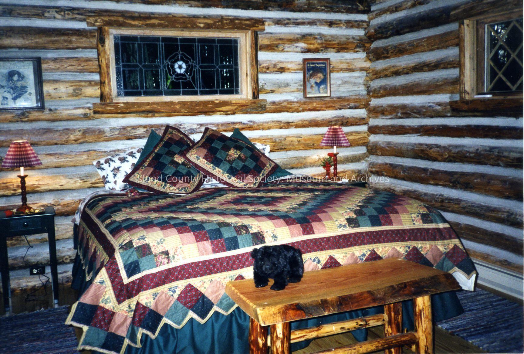 Guest House Bed & Breakfast, Greenbank. Bedroom of log cottage. Bed is covered with colorful quilt and many pillows. At base is log table with stuffed bear. Small bedside tables with red-shaded lamps. Walls are round logs with gray chinking. Log-framed window above bed with stained glass. Art prints in frames on walls.