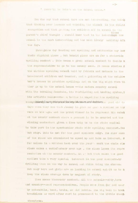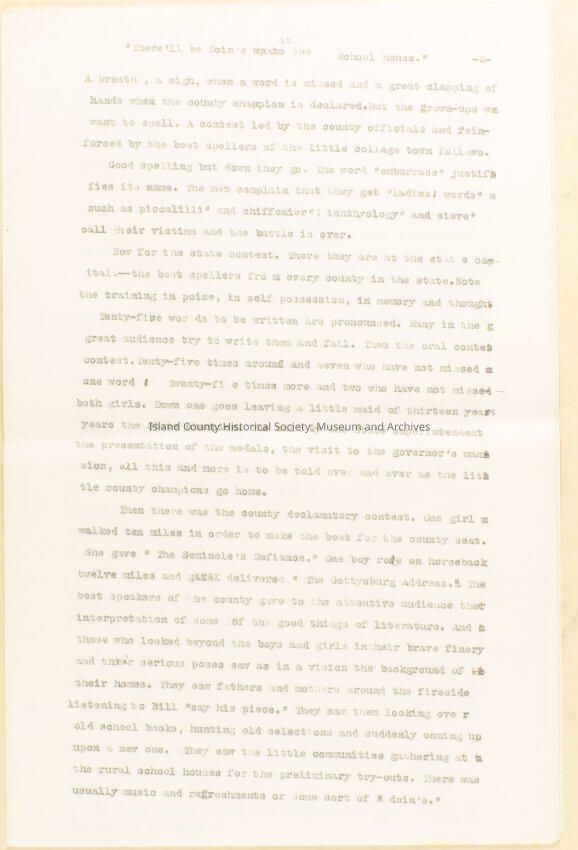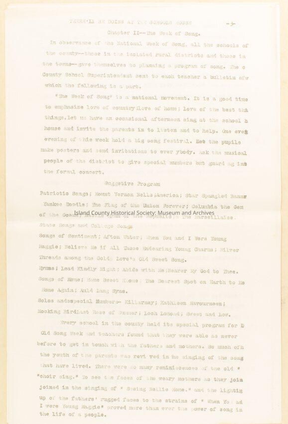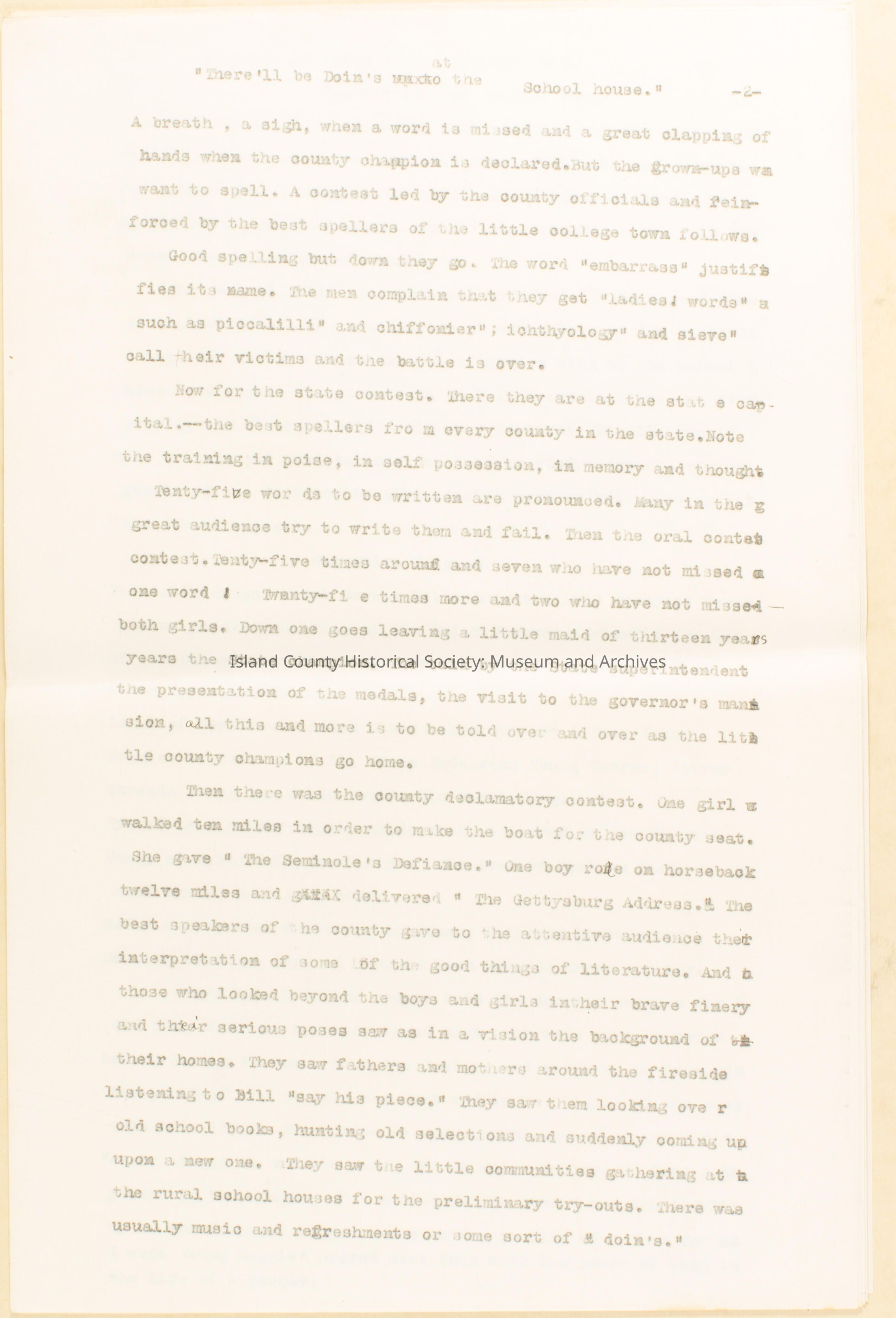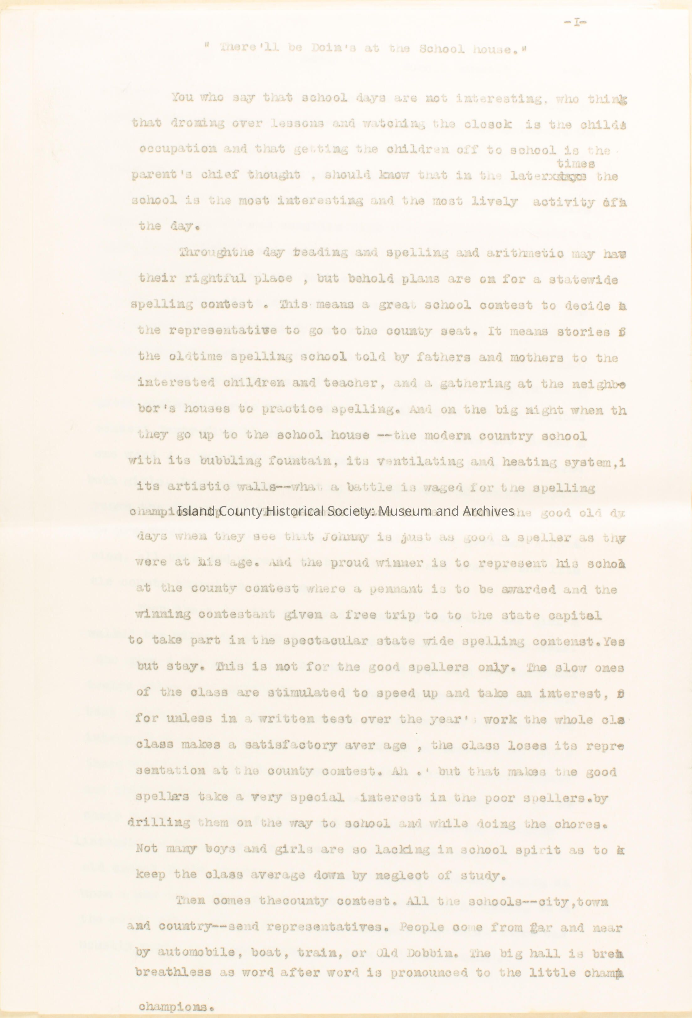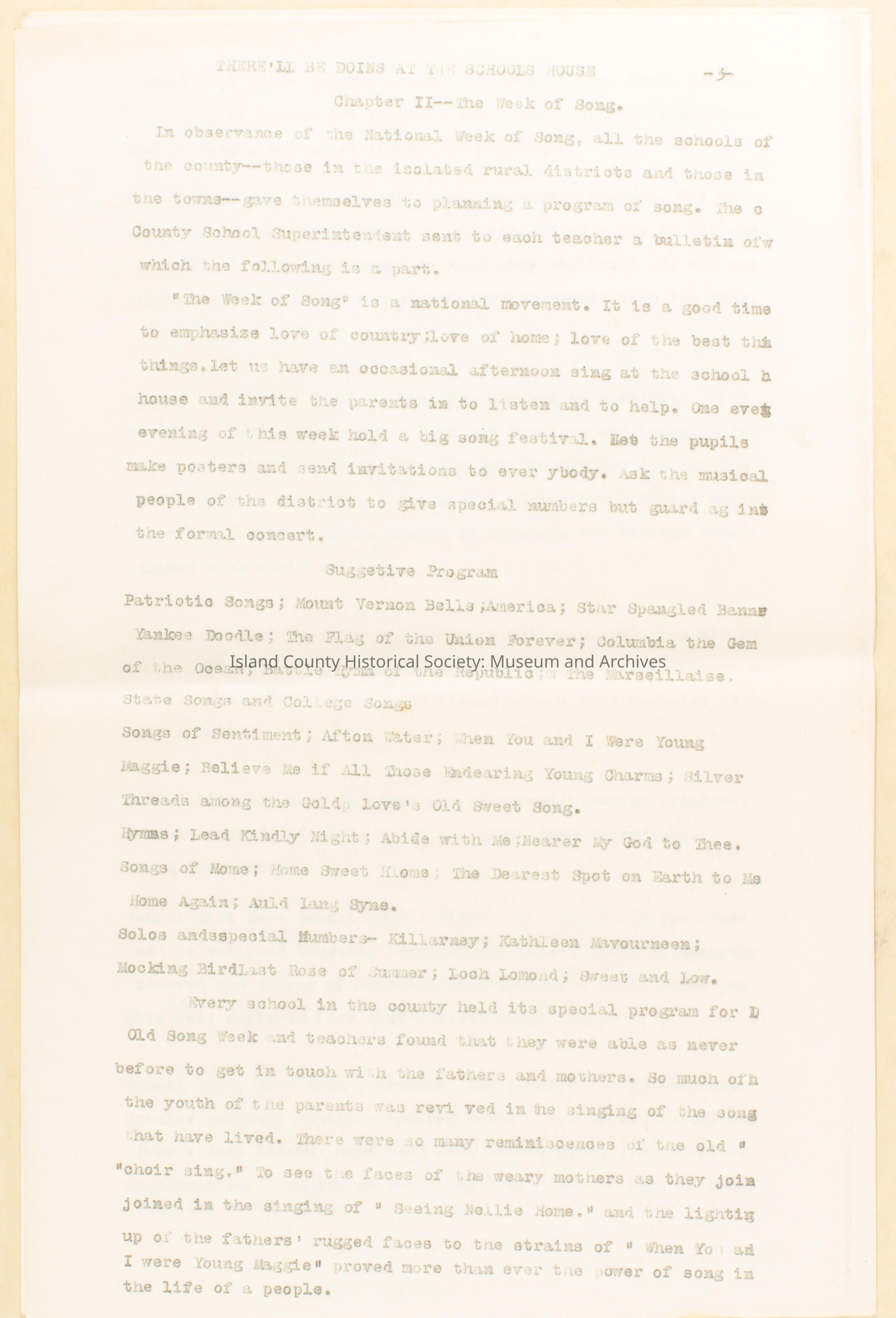 11-page typed paper that was used in: Magazine - Normal Instructor and Primary Plans, February 1918. An article on pages 21-22: "There'll be Doin's at the Schoolhouse" is written by Mrs. Evelyn Spencer, Superintendent of Schools, Island County, Washington. 2018.038.097.Lexicon
