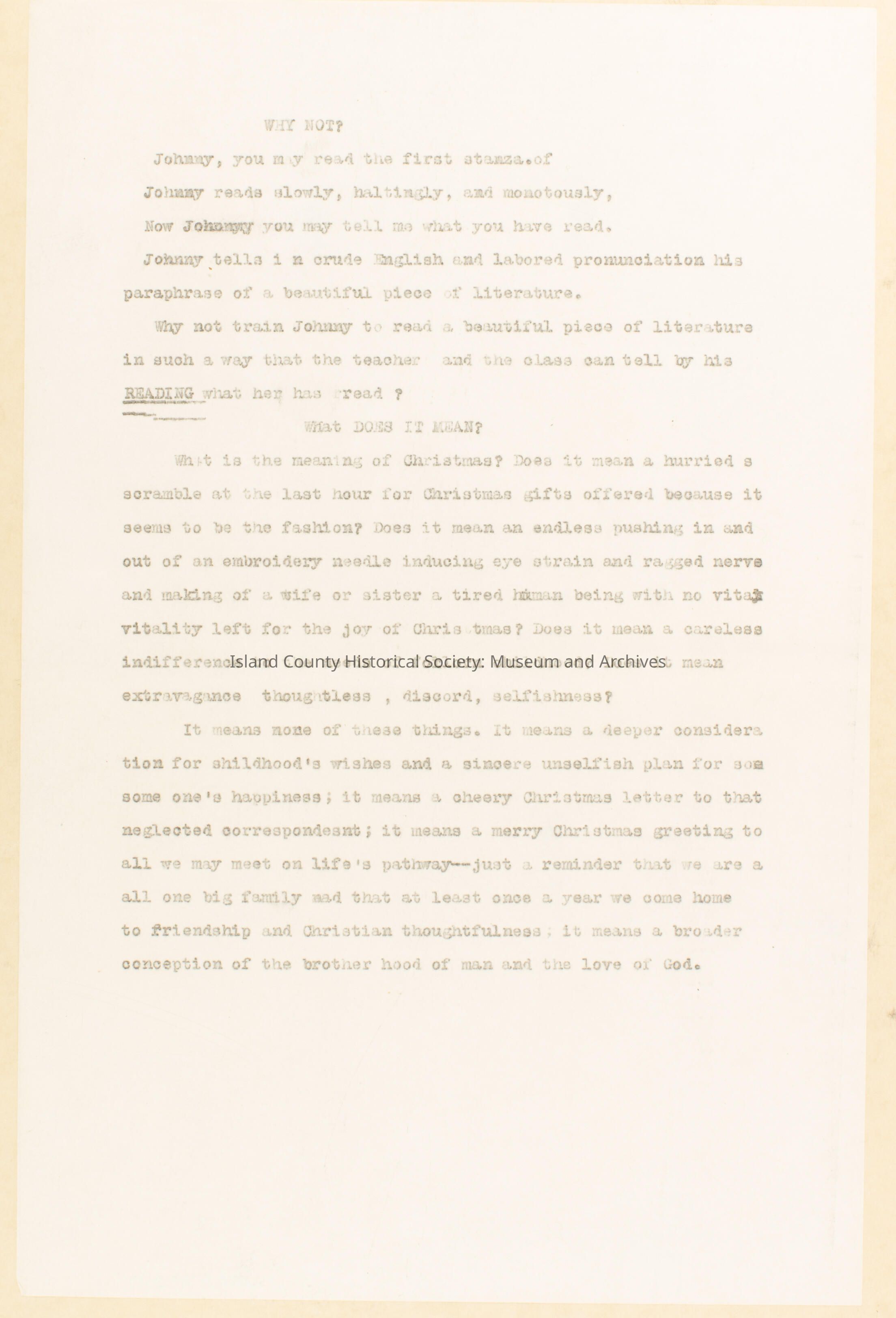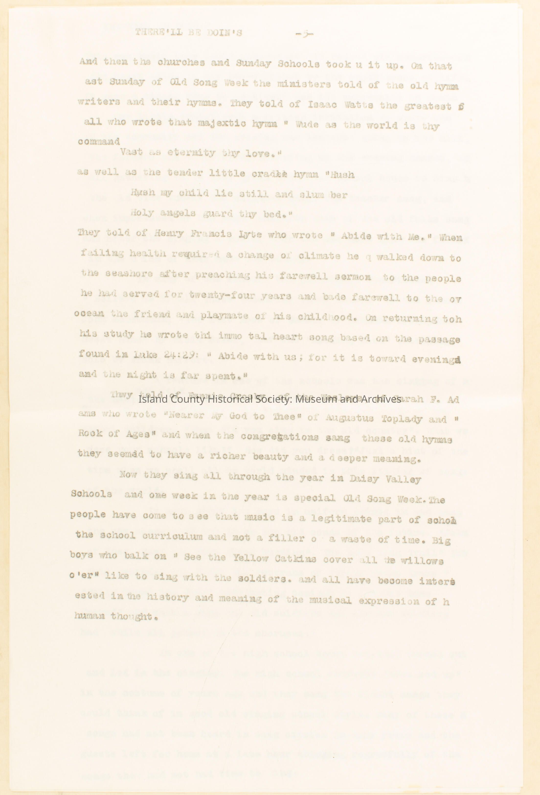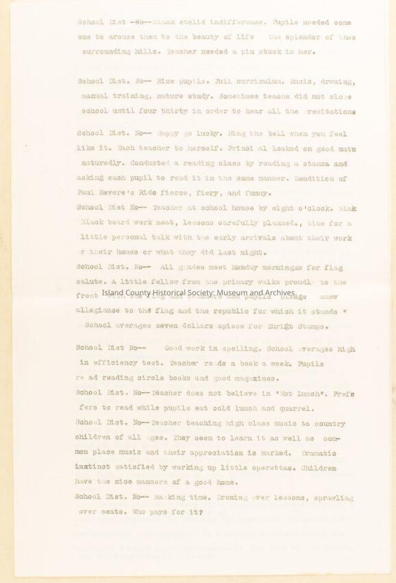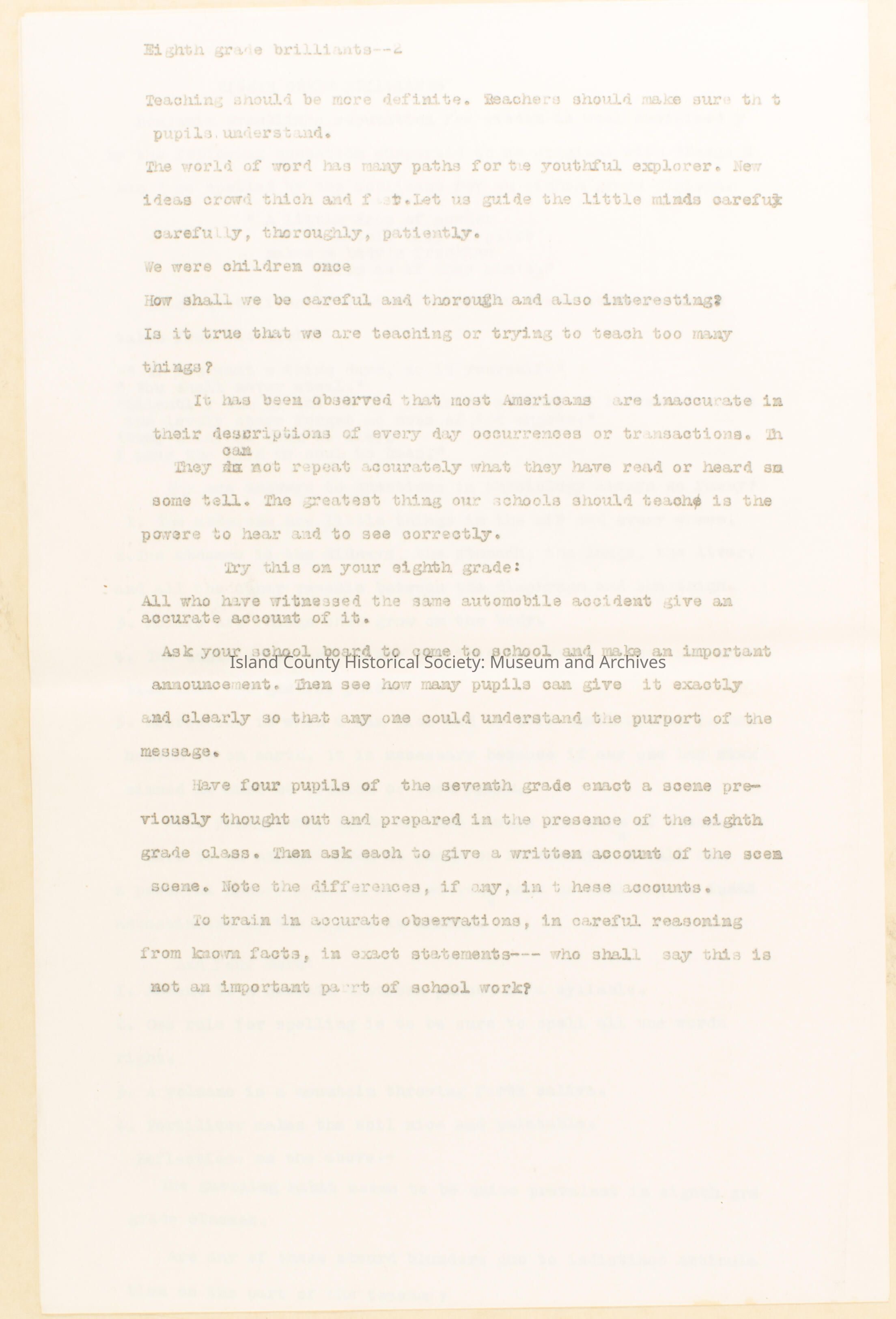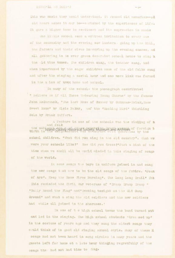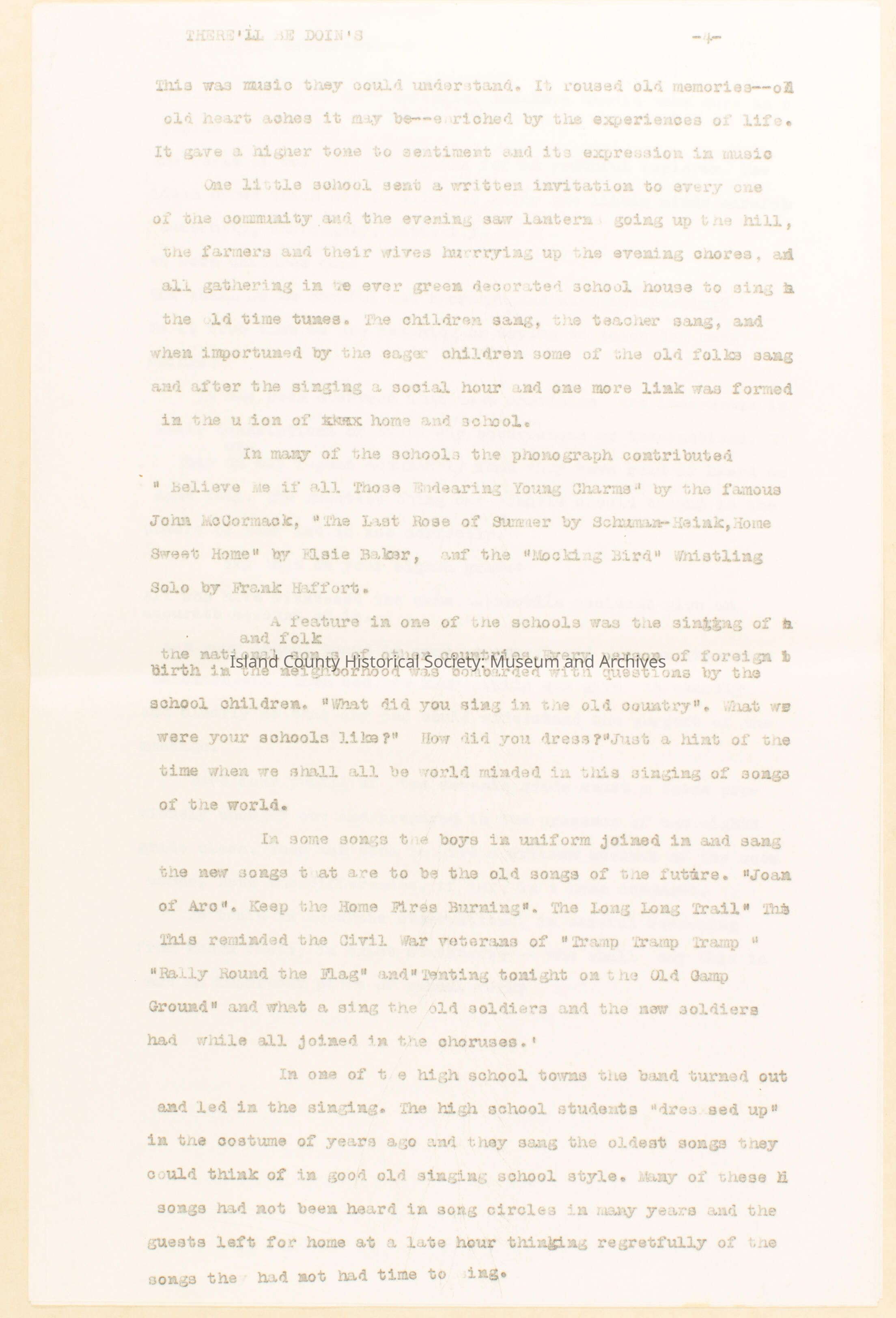 11-page typed paper that was used in: Magazine - Normal Instructor and Primary Plans, February 1918. An article on pages 21-22: "There'll be Doin's at the Schoolhouse" is written by Mrs. Evelyn Spencer, Superintendent of Schools, Island County, Washington. 2018.038.097.Lexicon