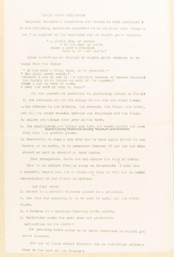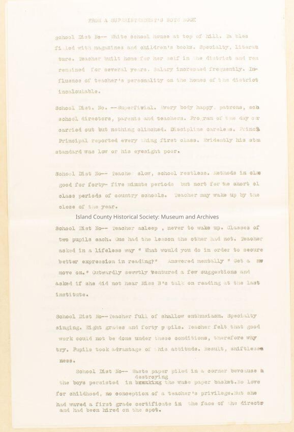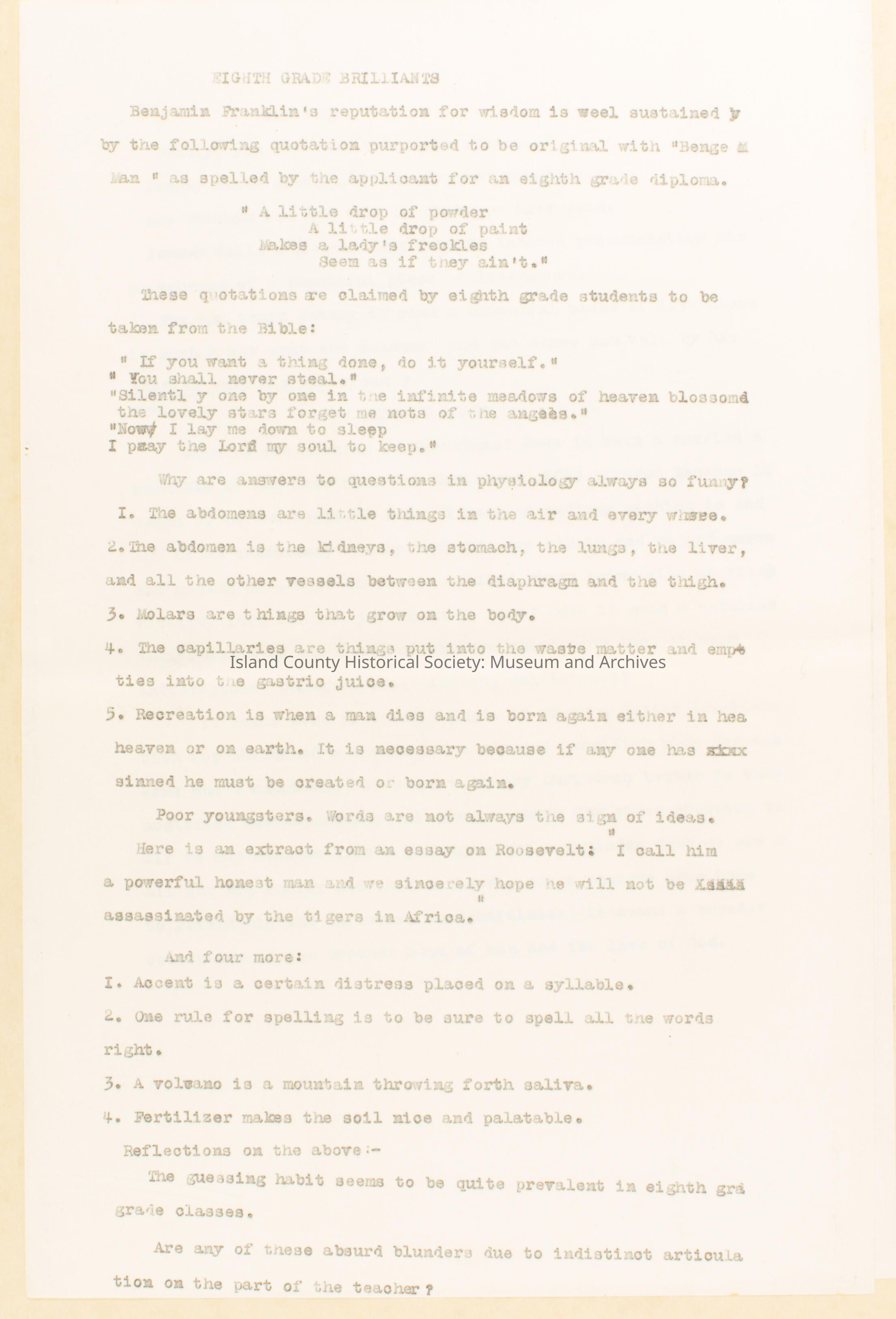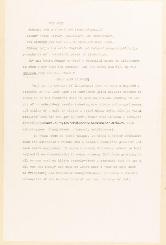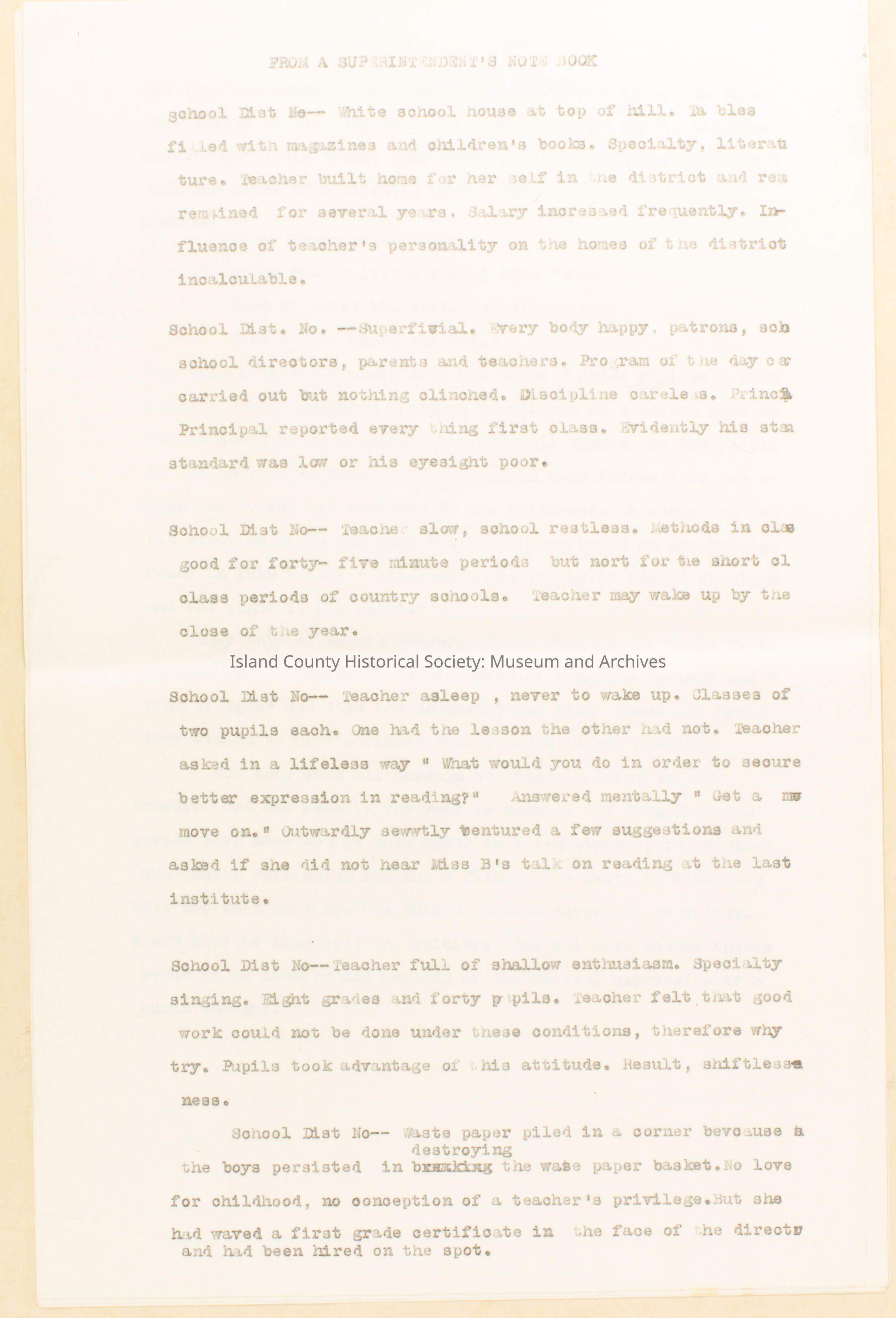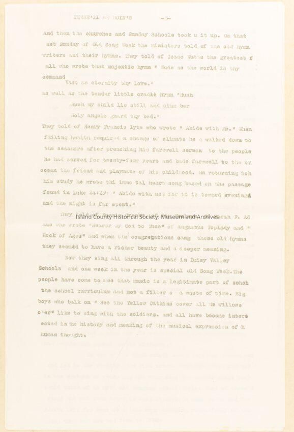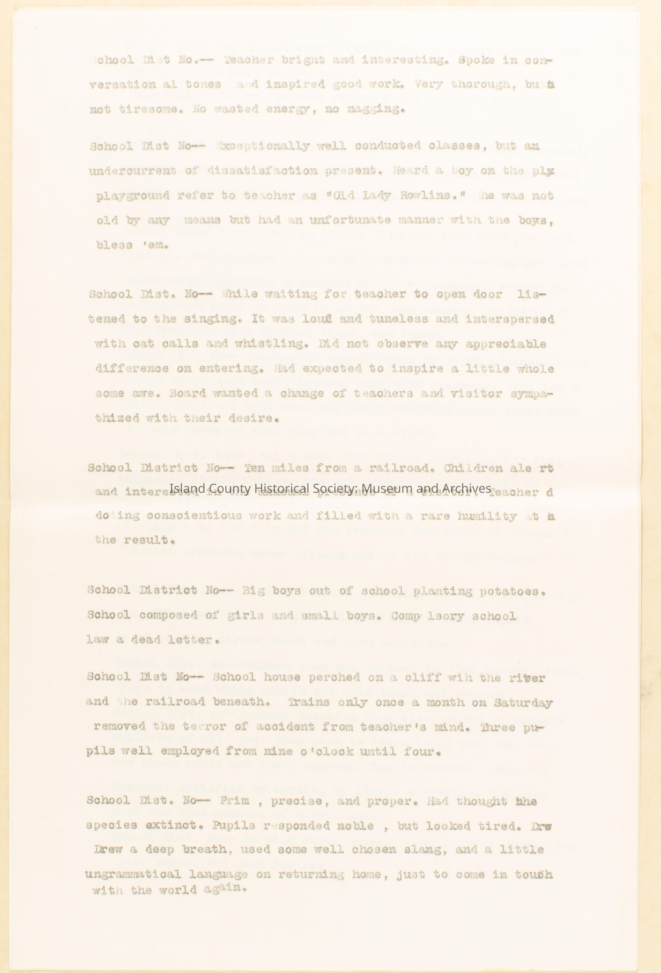 11-page typed paper that was used in: Magazine - Normal Instructor and Primary Plans, February 1918. An article on pages 21-22: "There'll be Doin's at the Schoolhouse" is written by Mrs. Evelyn Spencer, Superintendent of Schools, Island County, Washington. 2018.038.097.Lexicon