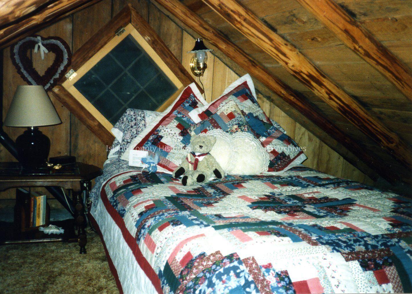 Guest House Bed & Breakfast, Greenbank. Loft bedroom of log cottage. Single bed is covered with colorful quilt, many pillows, and teddy bear. Bedside table on left with large lamp, radio, books and decorative items. Black plumbing vent pipe on wall behind. Shag carpet. Wall to rear is plank-covered. Log-framed window above bed is diamond-shaped. Heart-shaped wreath on left and wall lamp on right. Roof is planked with log rafters.Lexicon