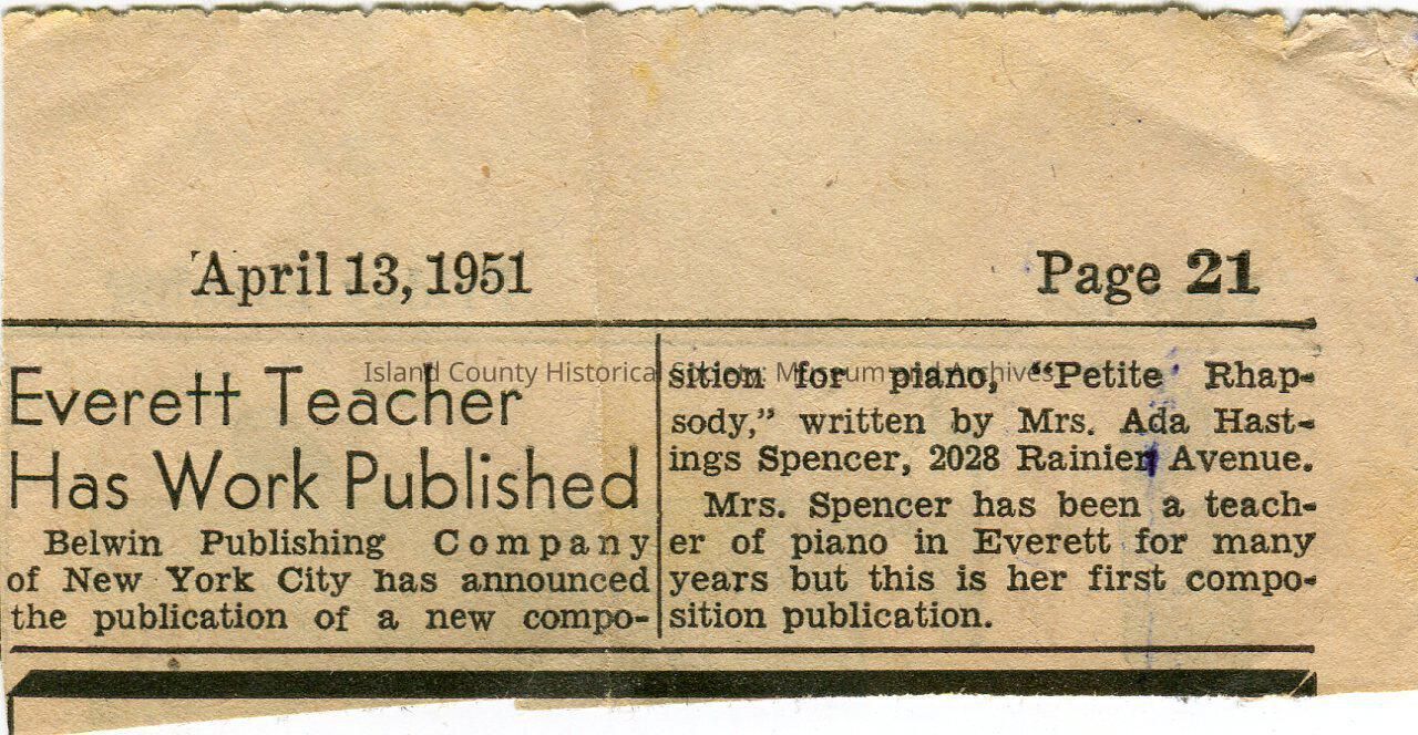 Newspaper clipping dated April 13, 1951, page 21 (no detail on name of newspaper). Article about Mrs. Ada Hastings Spencer. She was a piano teacher in Everett. Her piano musc "Petite Rhapsody" was published.