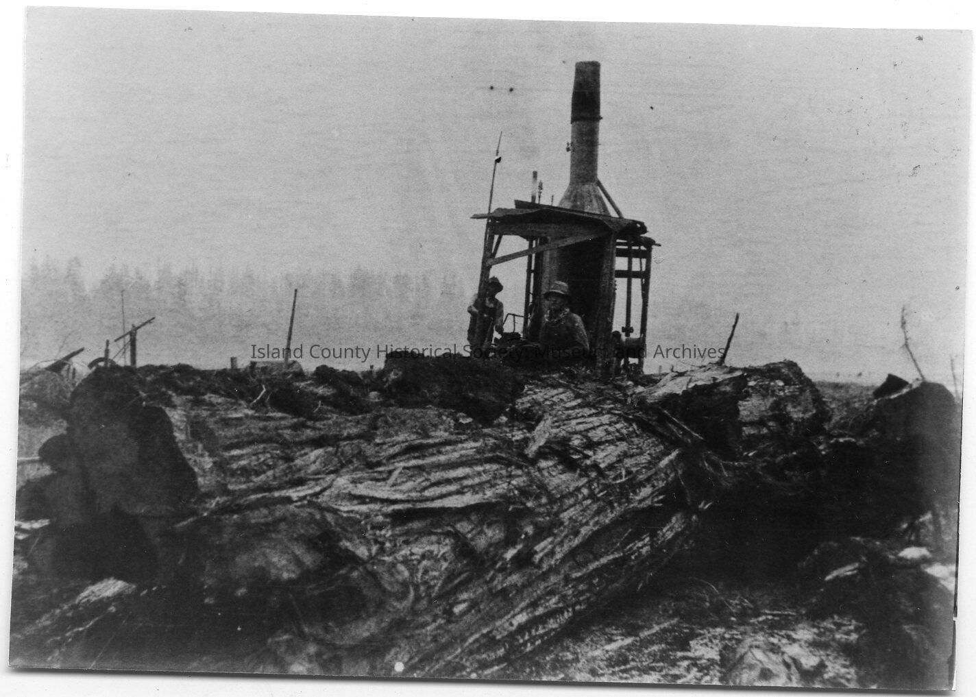 Black and white photo of two men logging, using an engine. Pictures used in book, "Whidbey Island Memories: Screwball Things I Remember." Caption: A Donkey Engine used in logging and clearing land. Photo No. 13, Page 25. Photograph provided to author by: Karl Ducken.Lexicon