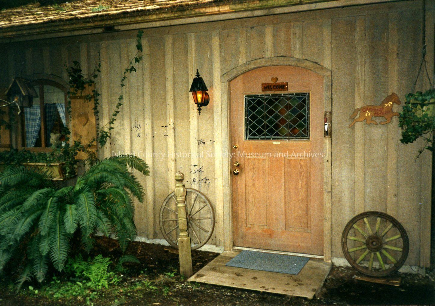 Guest House Bed & Breakfast, Greenbank. Front door of Carriage House. The panel door opens on left and has colored window with angled lead and arched top with welcome sign above window. Carriage lamp on left and "Carriage House" horse sign on right. Walls are board and batten in beige color. Window to left is arched with flower box, heart-decorated shutter and gingham curtains. Large fern below window. Two wagon wheels lean against wall to right and left of door. Post stands on left of wood step.