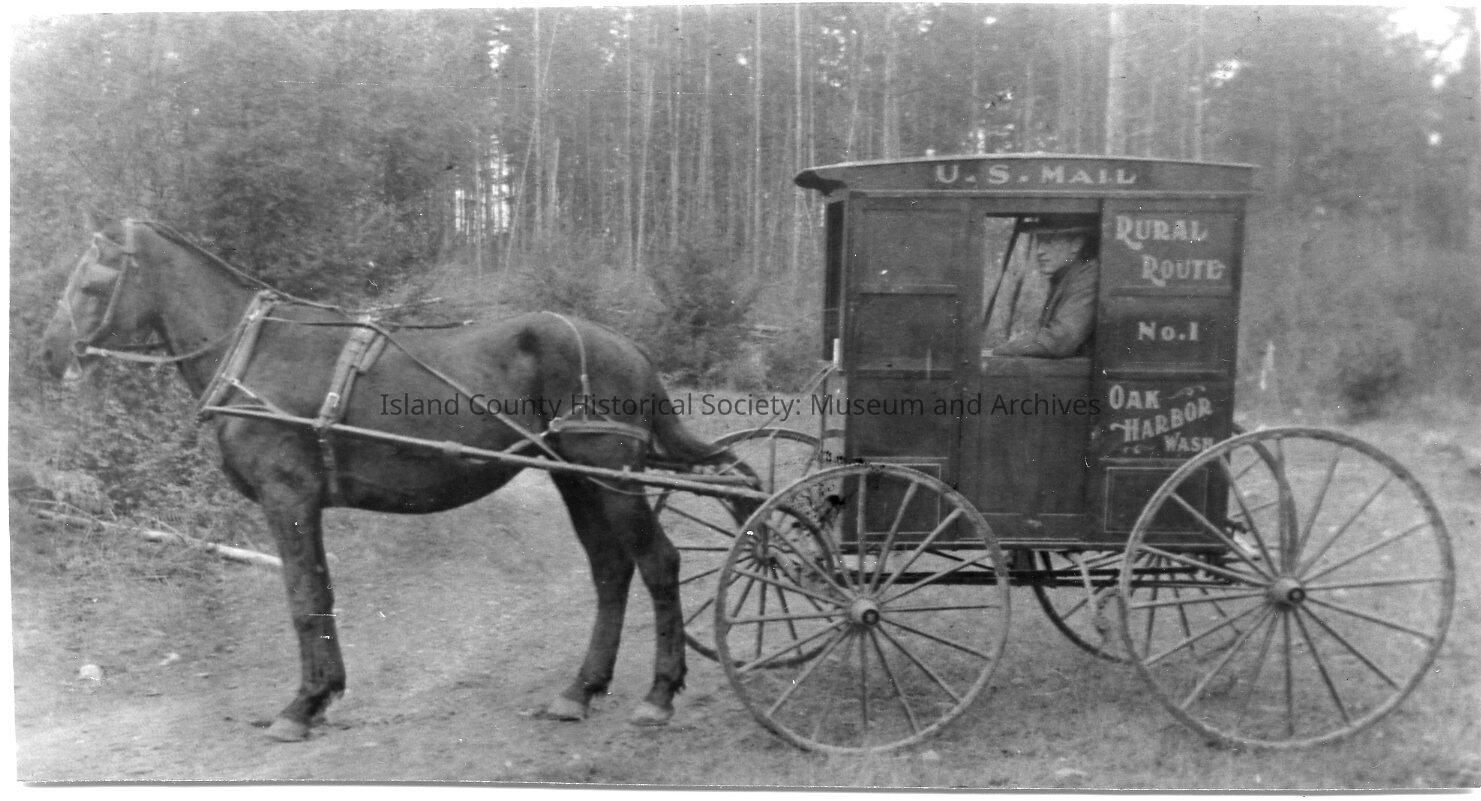 Black and white photo of man driving a horse-drawn wagon with U.S. Mail, Rural Route No. 1 Oak Harbor, Wash. on the side. Pictures used in book, "Whidbey Island Memories: Screwball Things I Remember." Caption: Irving Adams and his one-horsepower rural mail delivery buggy. c. 1910. Photo No. 15, Page 27. Photograph provided to author by: Bernice Adams McGreevy.Lexicon