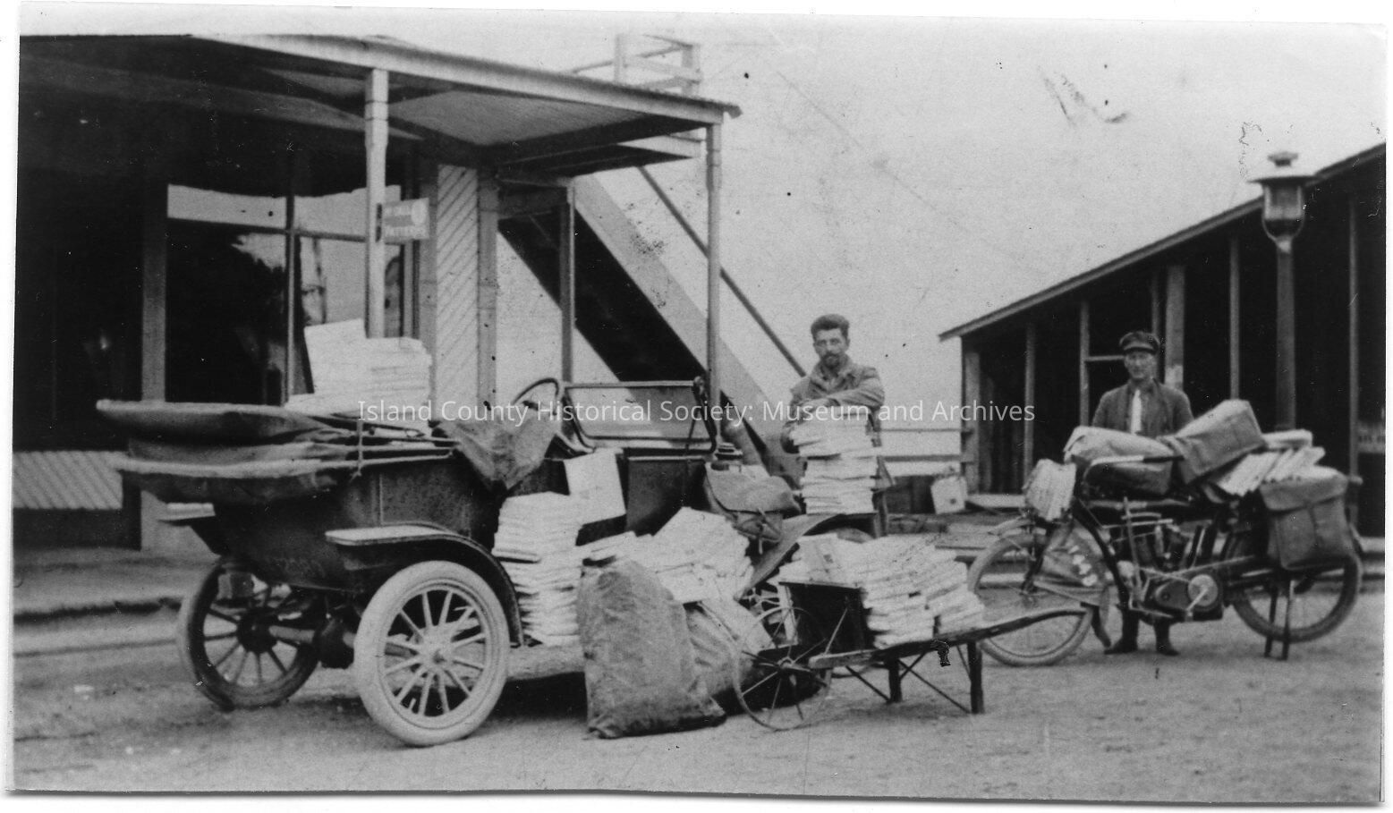 Black and white photo of two men sorting mail, mail bags on an old car and motorbike. Pictures used in book, "Whidbey Island Memories: Screwball Things I Remember." Caption: Vince Stroops and Irving Adams, Oak Harbor mailmen. Photo No. 16, Page 27. Photograph provided to author by: Bernice Adams McGreevy.Lexicon