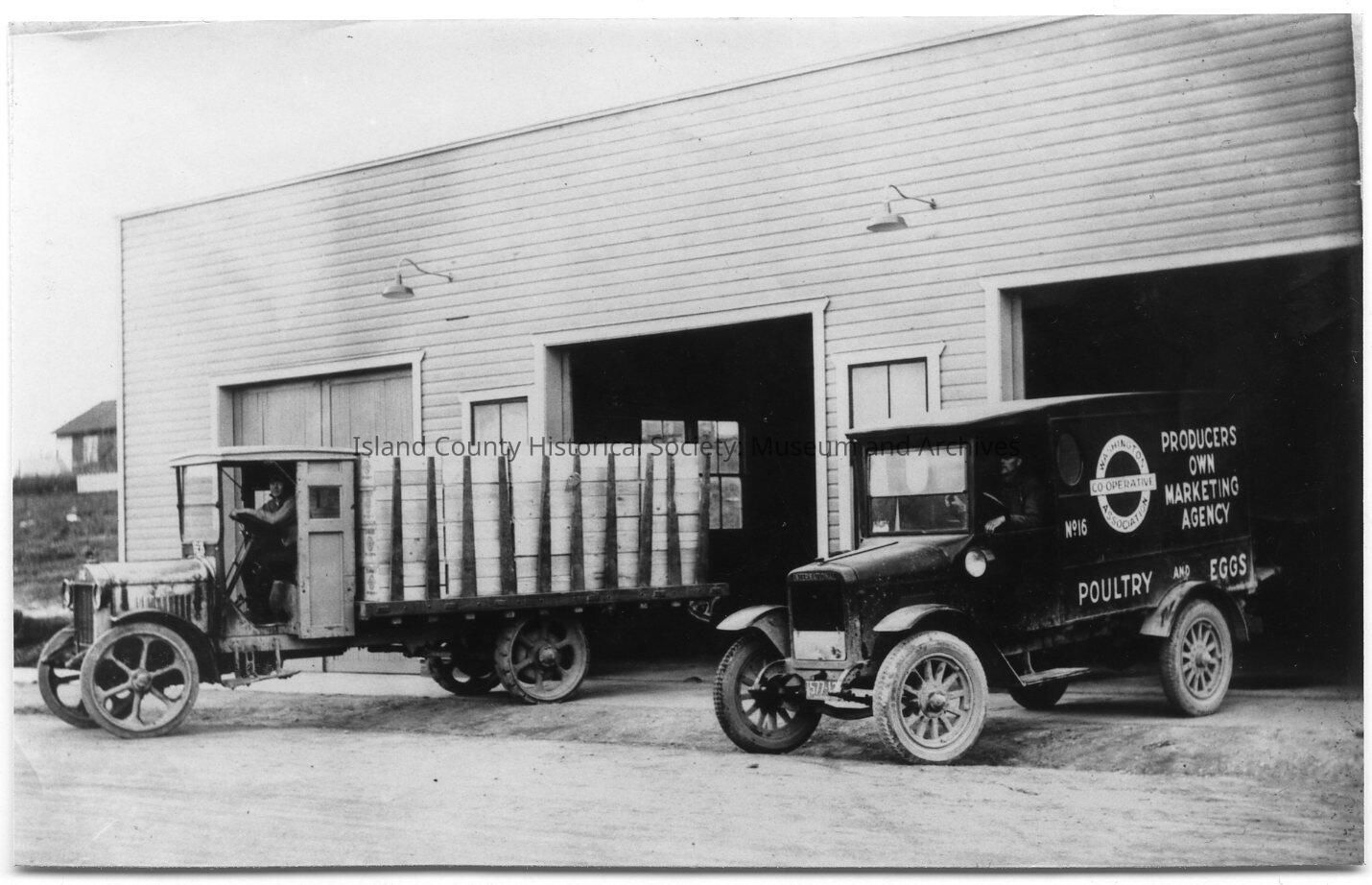 Black and white photo of a man in a delivery van, backed into a warehouse; another van with Producers Own Marketing Agency No. 16 Poultry and Eggs - on the side is on it's left at another bay. Pictures used in book, "Whidbey Island Memories: Screwball Things I Remember." Caption: Two early trucks, one with hard rubber tires. Photo No. 19, Page 32. Photograph provided to author by: Barbara Beeksma.Lexicon