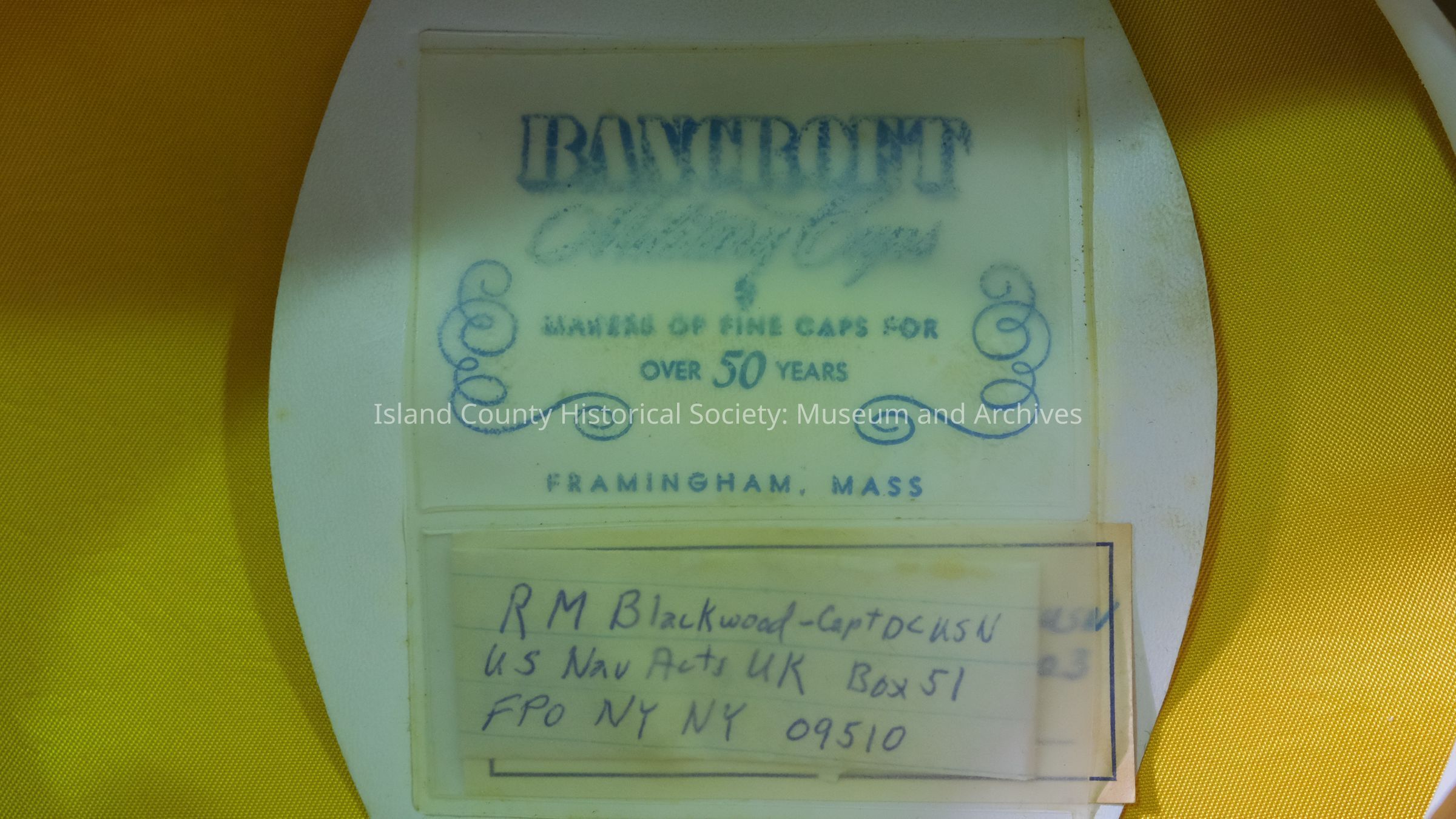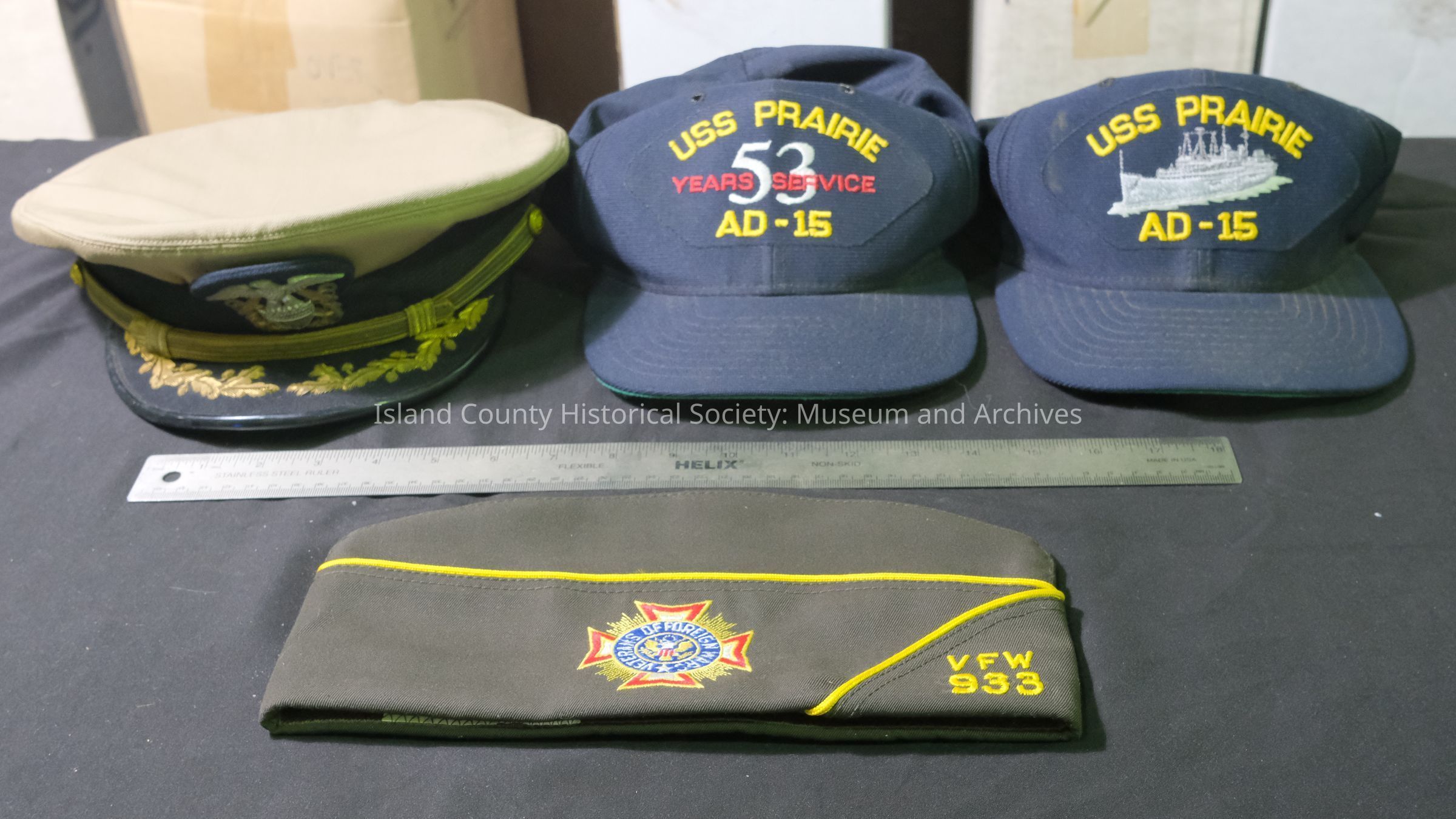 Four hats belonging to Capt. RM Blackwood, DC USN, two military uniform hats and two veterans caps