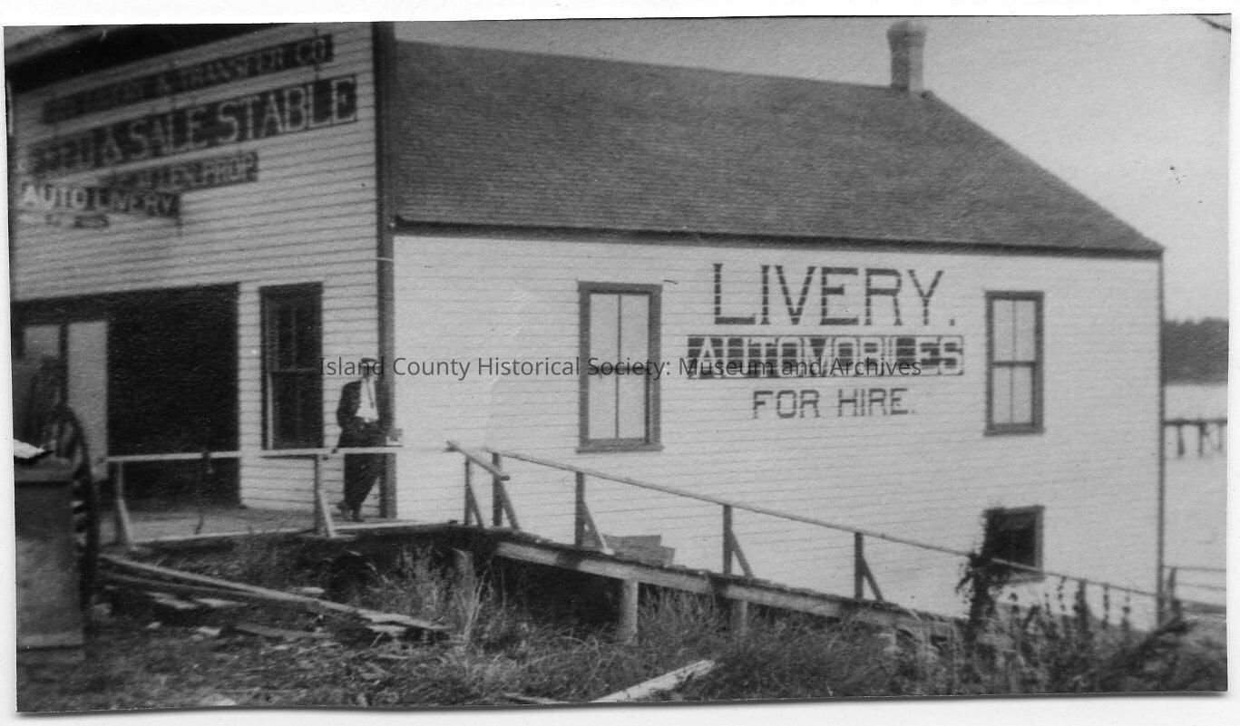 Black and white photo of an automobile livery, on the coast with pier in background, an leaning on the corner of the building beside the down ramp. Livery Automobiles For Hire on the side of the building. One the front: (some words can't see) Transfer Co., Sale Stable, Allen Prop., Auto Livery. Pictures used in book, "Whidbey Island Memories: Screwball Things I Remember." Caption: Oak Harbor's first garage operated by Grover Allen. Photo No. 22, Page 33. Photograph provided to author by: Paul Allen.Lexicon