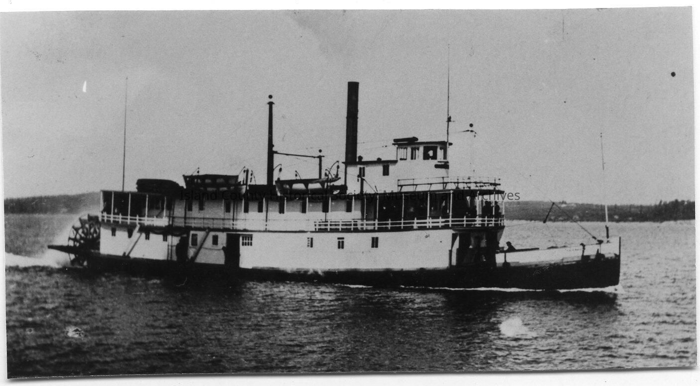 Black and white photo of a steamship, paddlewheeler. Pictures used in book, "Whidbey Island Memories: Screwball Things I Remember." Caption: "Fairhaven". Photo No. 23, Page 37. Photograph provided to author by: Rance Zylstra.