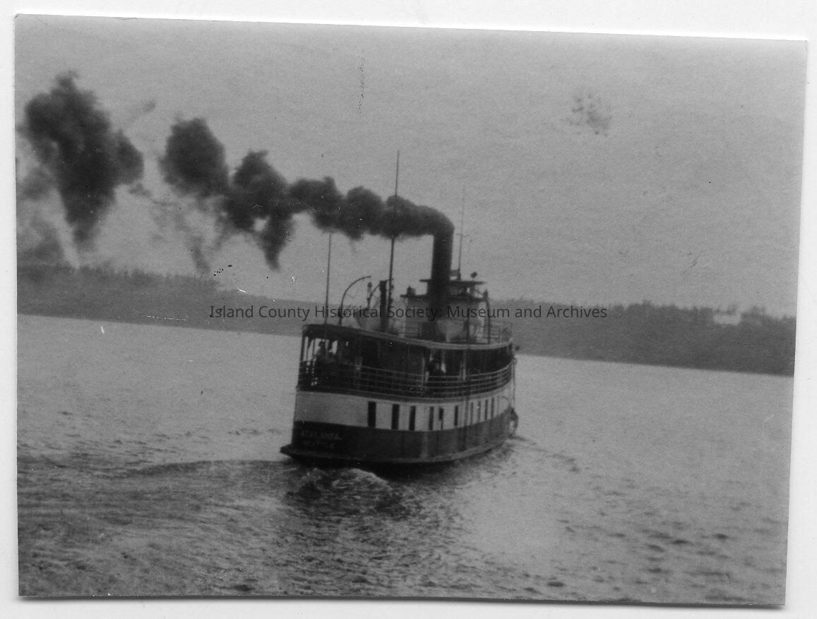 Black and white photo of a steamship, sailing away. Pictures used in book, "Whidbey Island Memories: Screwball Things I Remember." Caption: "Atlanta" - Replaced "Calista". Continued Oak Harbor-Seattle run until passenger service was ended. Photo No. 26, Page 37. Photograph provided to author by: Mirth Hall.Lexicon