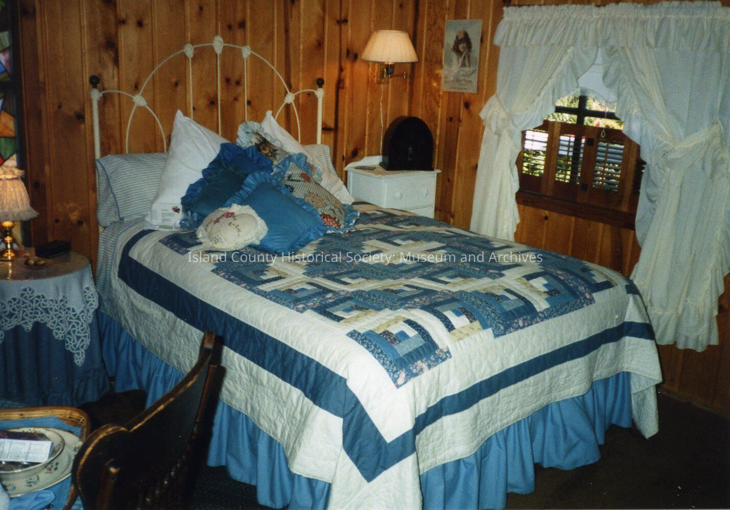 Guest House Bed & Breakfast, Greenbank. Bedroom of log cottage. Vertical wood paneling on walls; window to right has white curtains and louvered screens. Iron-framed bed with blue and white quilt and many pillows. Bed table to left has two skirts and small lamp; stained glass window behind. Small white chest on right with antique radio. Table in left foreground is set for breakfast.