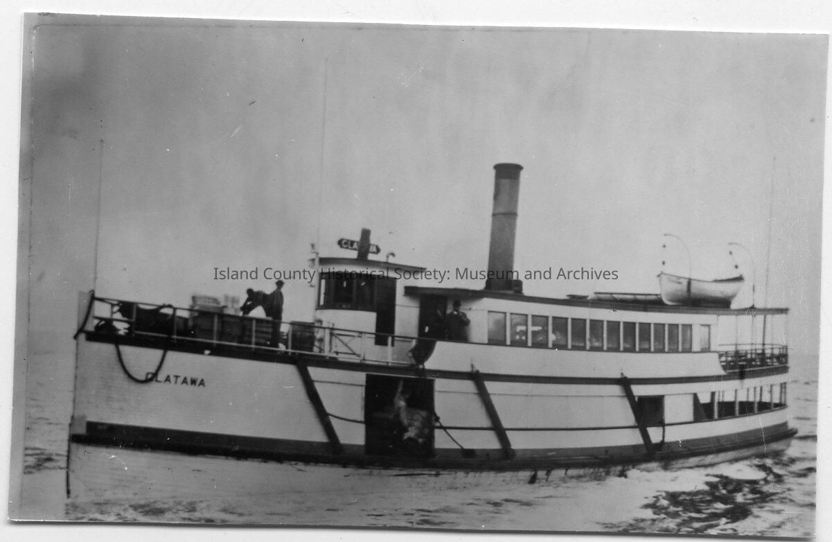 Black and white photo of a steamship, "Clatawa". Pictures used in book, "Whidbey Island Memories: Screwball Things I Remember." Caption: "Clatawa" Operated between Langley and Everett. Photo No. 27, Page 38. Photograph provided to author by: Oak Harbor Historical Society (O.H.H.S.)Lexicon