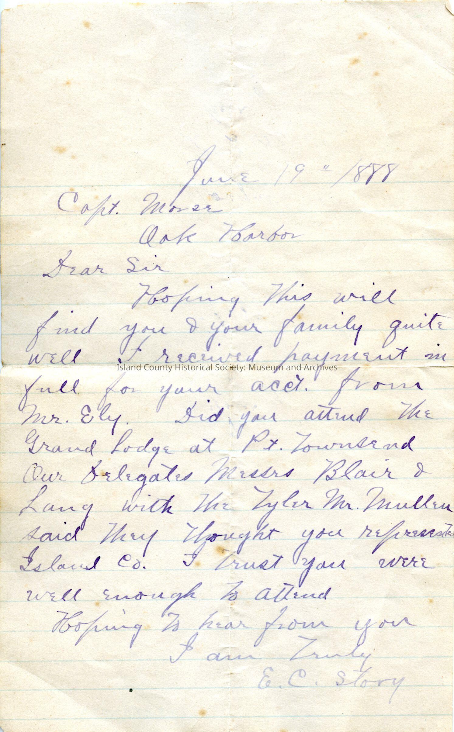 Letter dated June 19, 1888 to Captain Morer, Oak Harbor, from E. C. Story. Acknowledging payment in full to his account from Mr. Ely.