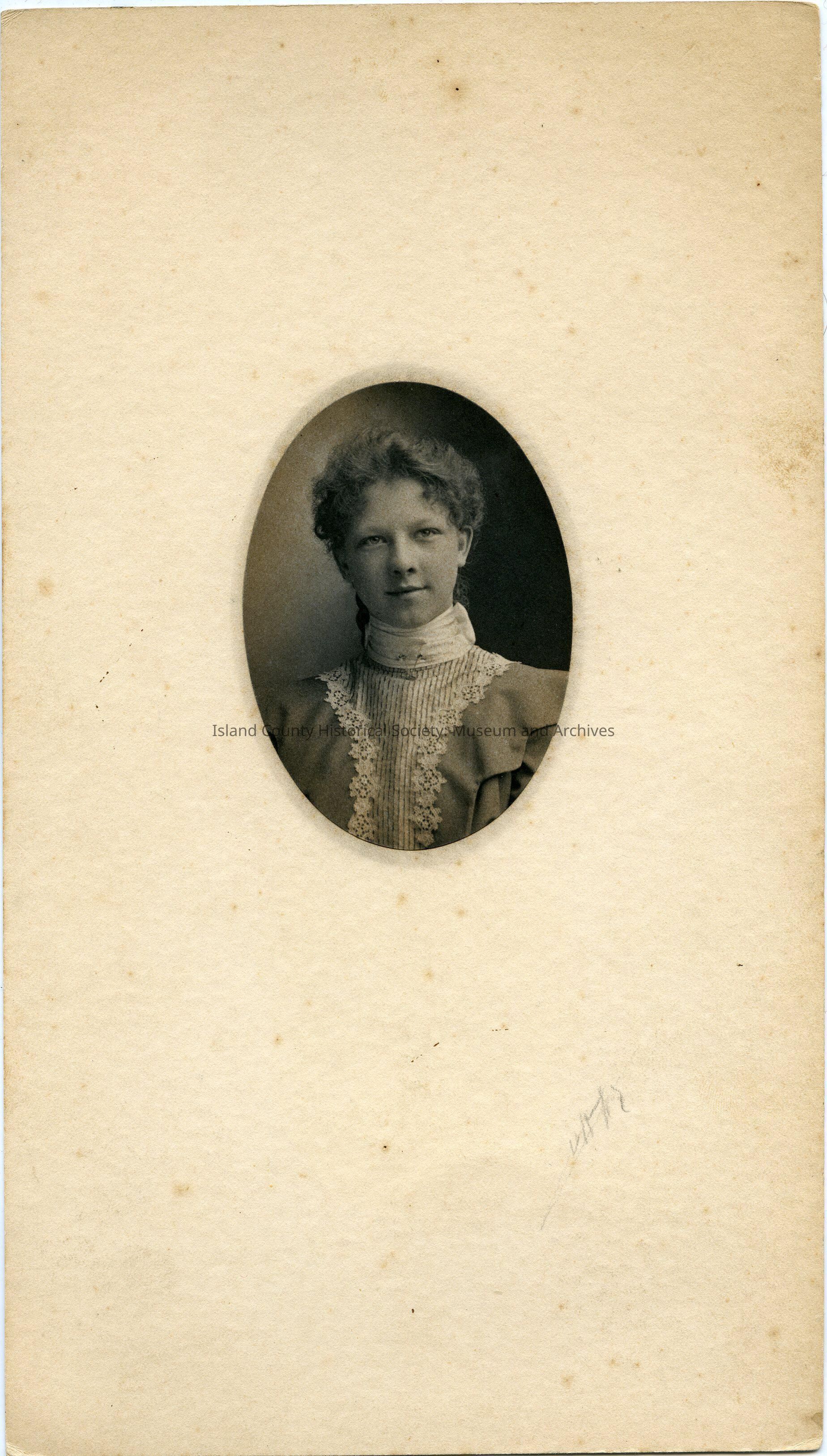 Small oval photo portrait of a young woman. She is wearing a dress with a lacy high collar and lace down the front, flounce around her shoulders. A pin is at her neck. On the back: Hazel Watson, about 16 years old.
