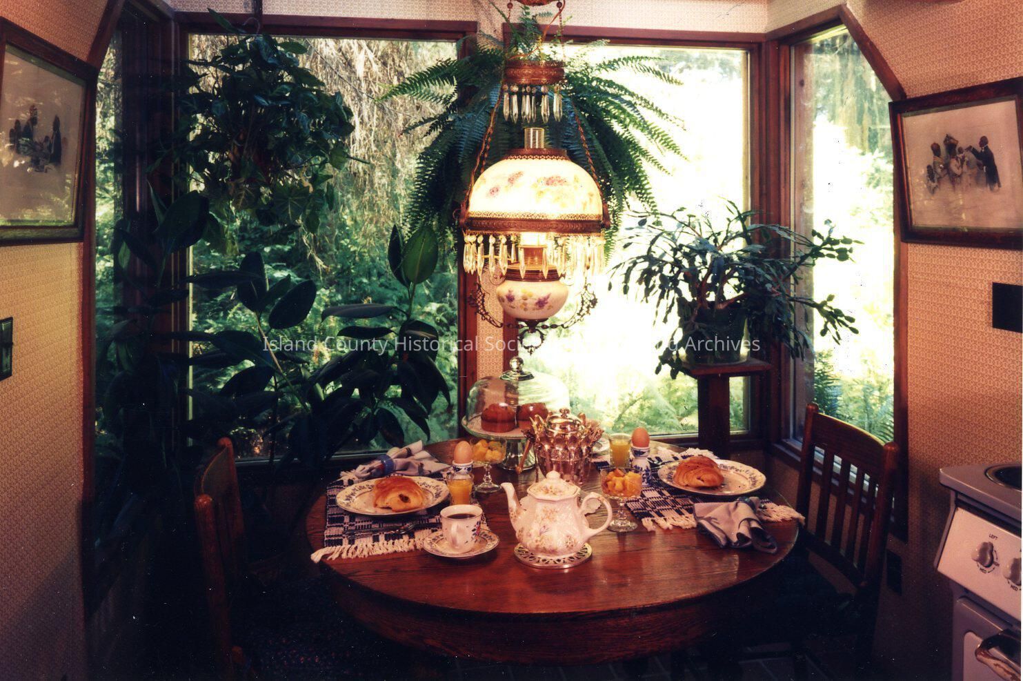 Guest House Bed & Breakfast, Greenbank. Lodge breakfast nook. Round dining table with three chairs sits in small nook with large windows behind. Green plants outside and inside. Antique chandelier above table. Framed pictures on walls. Table is set with breakfast items on fine china.