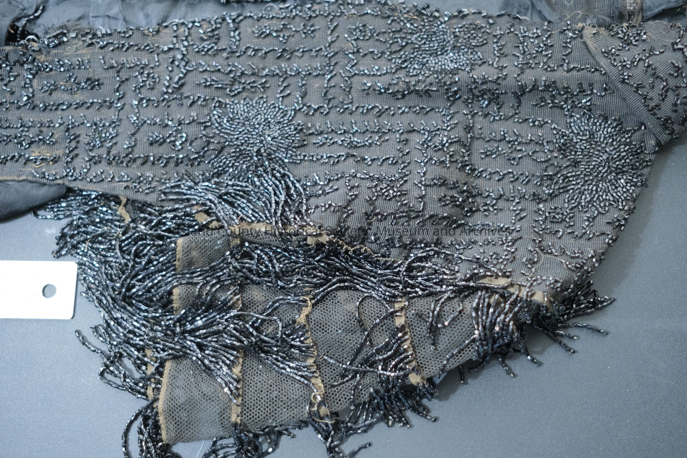 black w/ long beaded fringe cape; ribbed taffeta; black beads, mesh sleeves; two long tails down backCollection