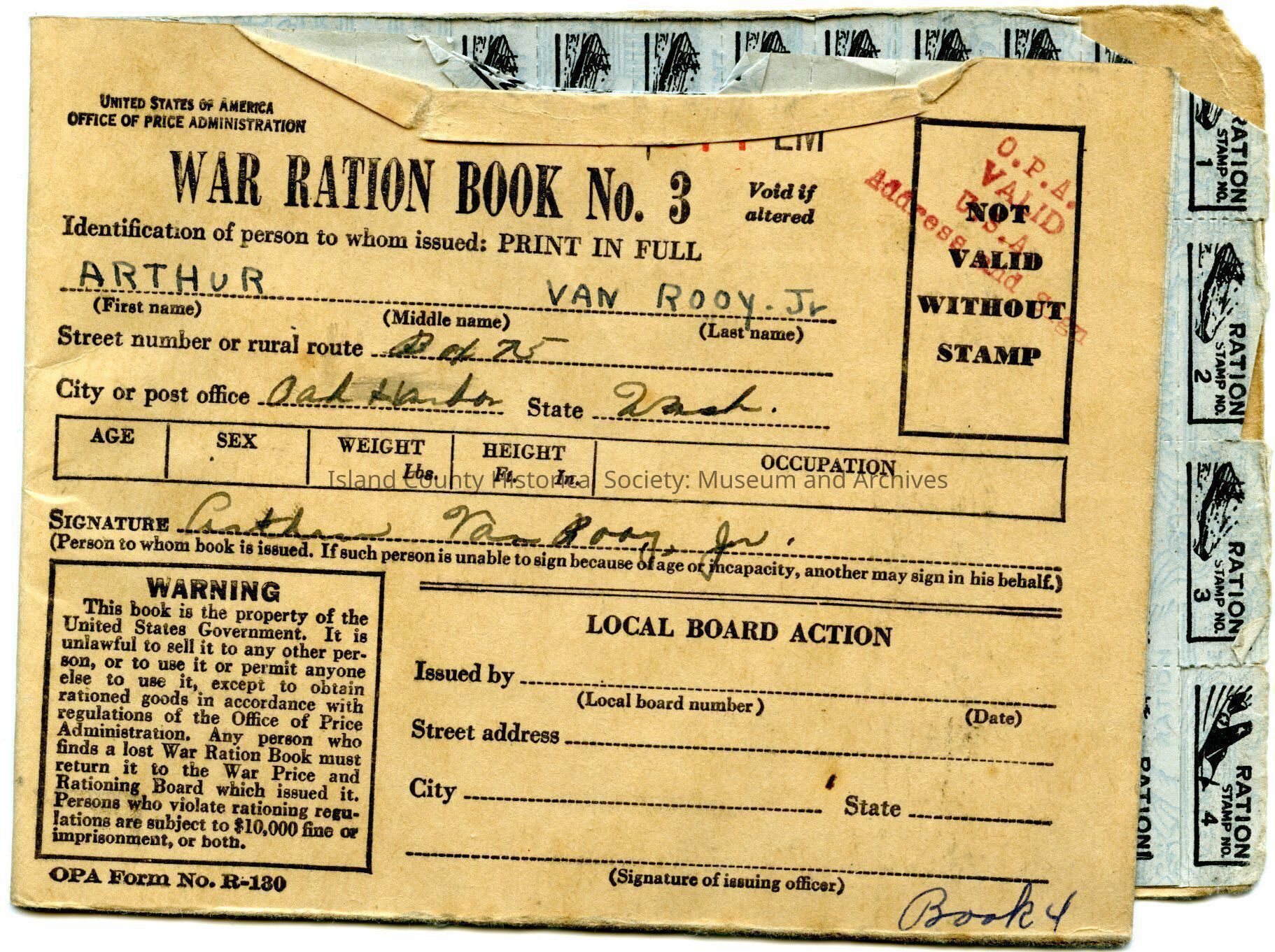 War Ration Book No. 3 - belonged to Arthur Can Rooy, Jr. of Oak Harbor. It has a couple pages of stamps. Issued by Office of Price Administration.
