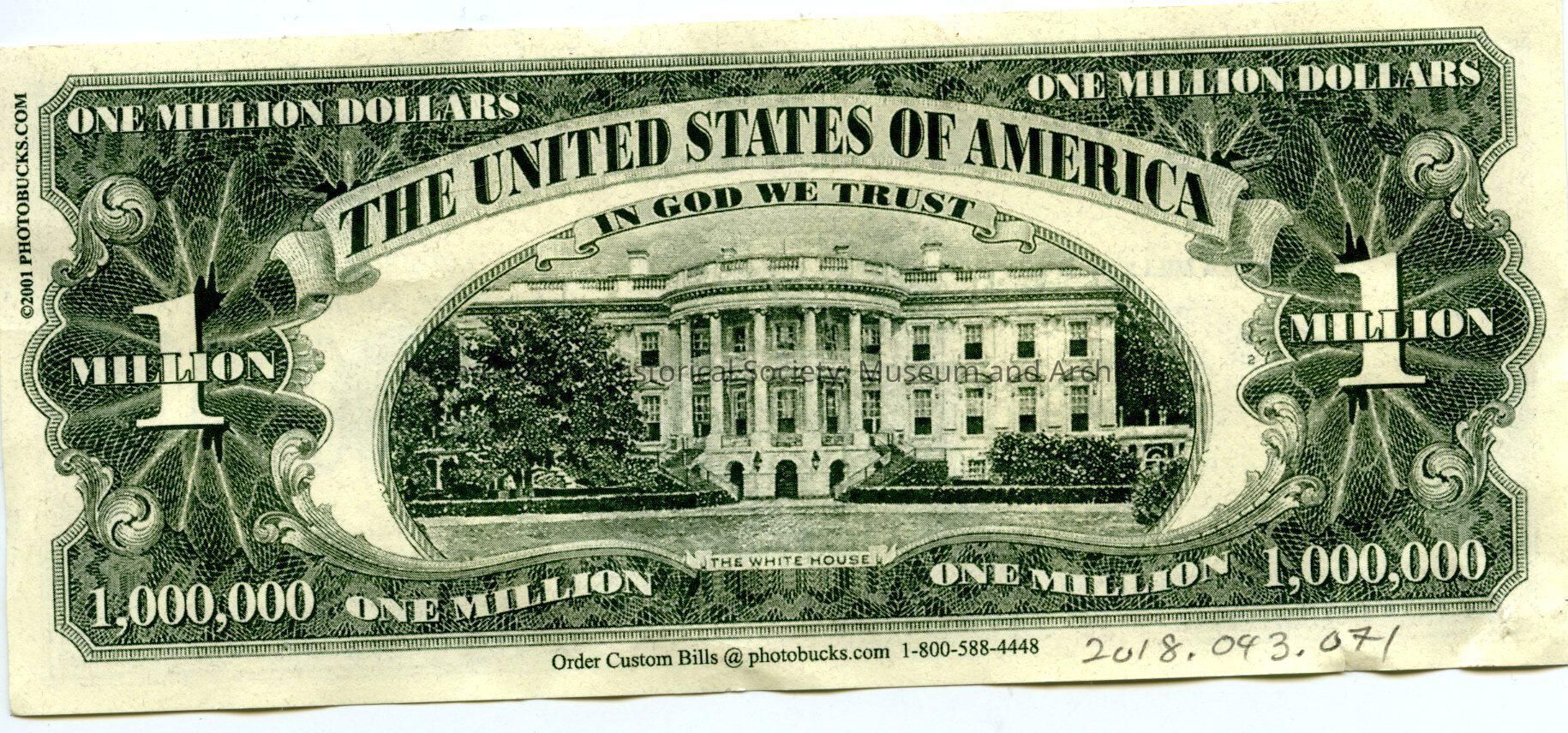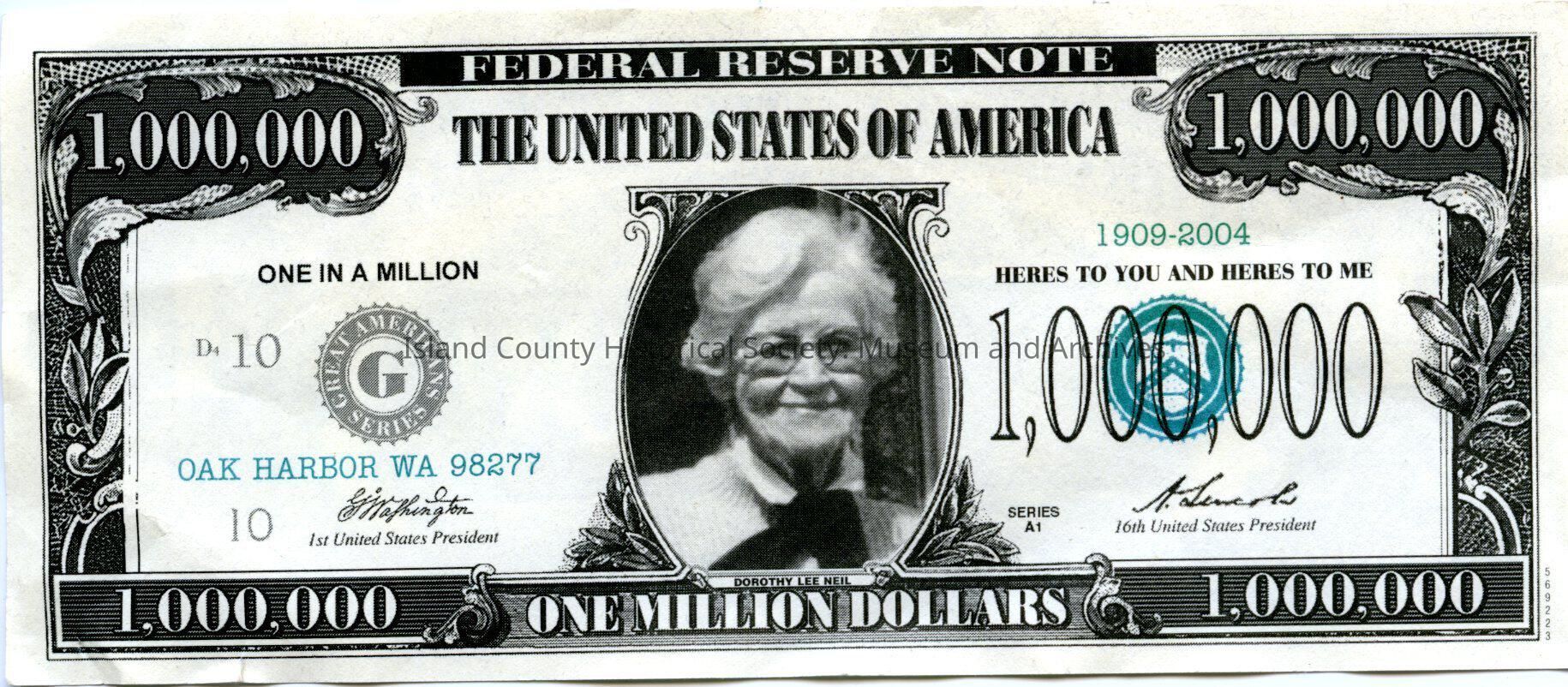 Play money - $1,000,000 (one million dollars) with the White House on one side and Dorothy Neil on the other. States One in a Million, Oak Harbor, WA 98277, 1909-2004, Here's to You and Here's to Me. Her caption: Dorothy Lee Neil.Lexicon
