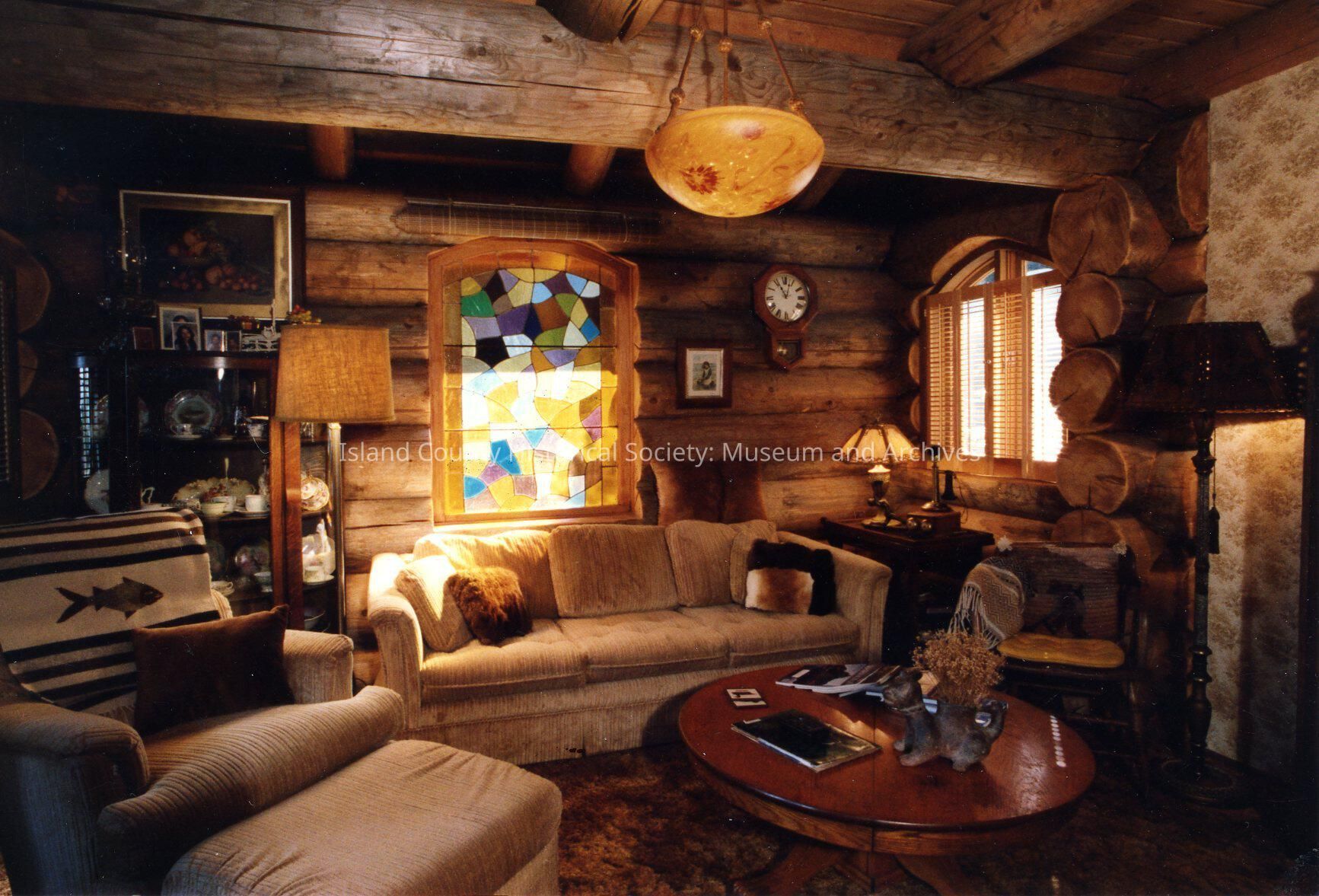 Guest House Bed & Breakfast, Greenbank. Lodge den. Walls are large diameter logs. Stained glass window to rear and louvered window on right. Plush couch and chair with round coffee table. display cabinet on wall holds antique dishes.